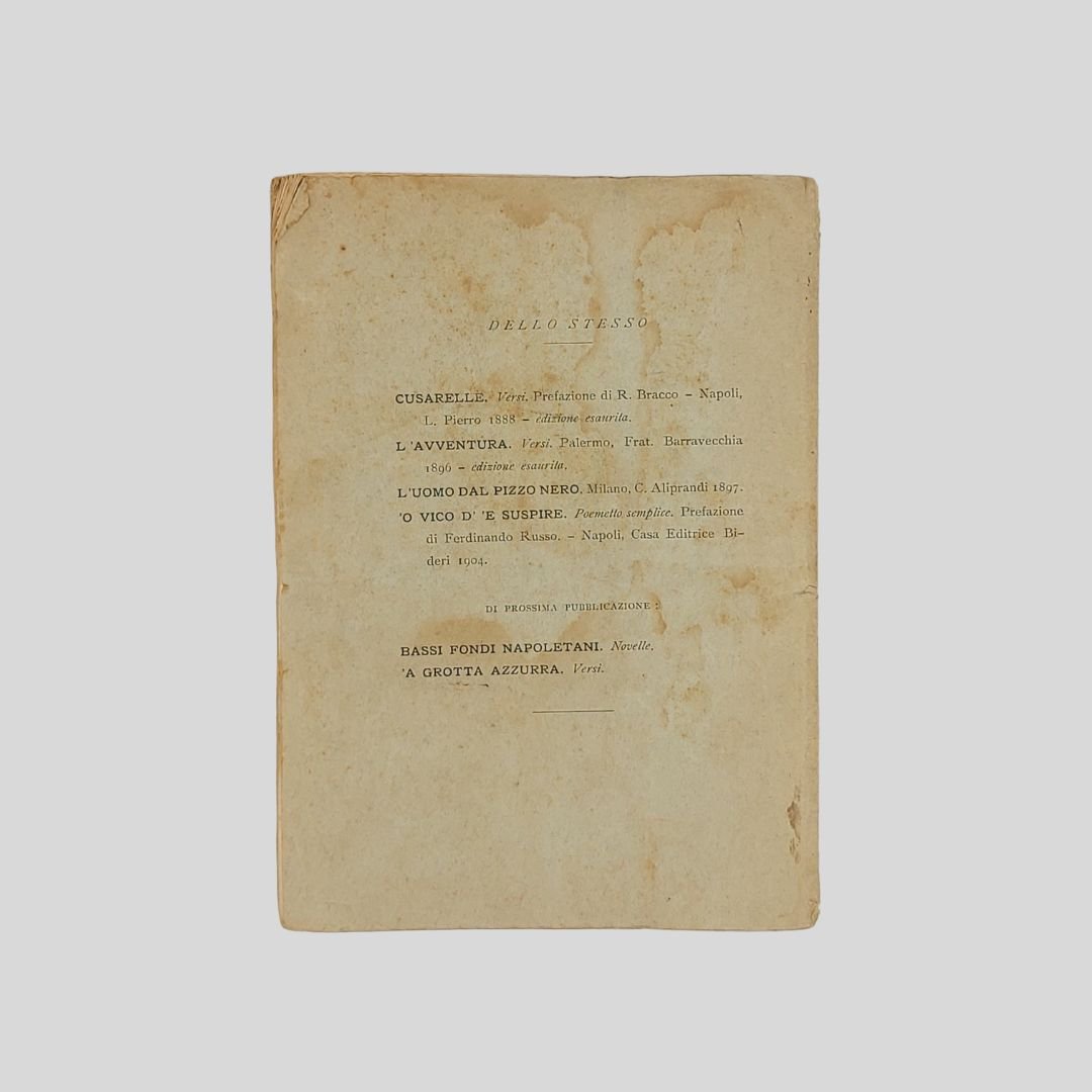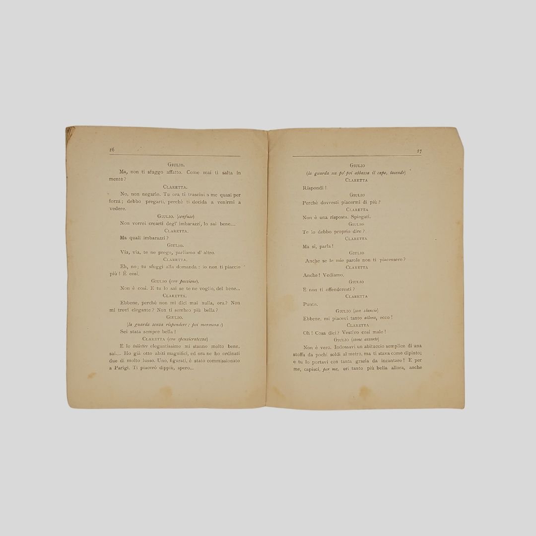 in-8° (cm 20,5), pp. 38. Tracce d’uso, aloni e fioriture. L’azione si svolge “Al presente – In una citta marittima”