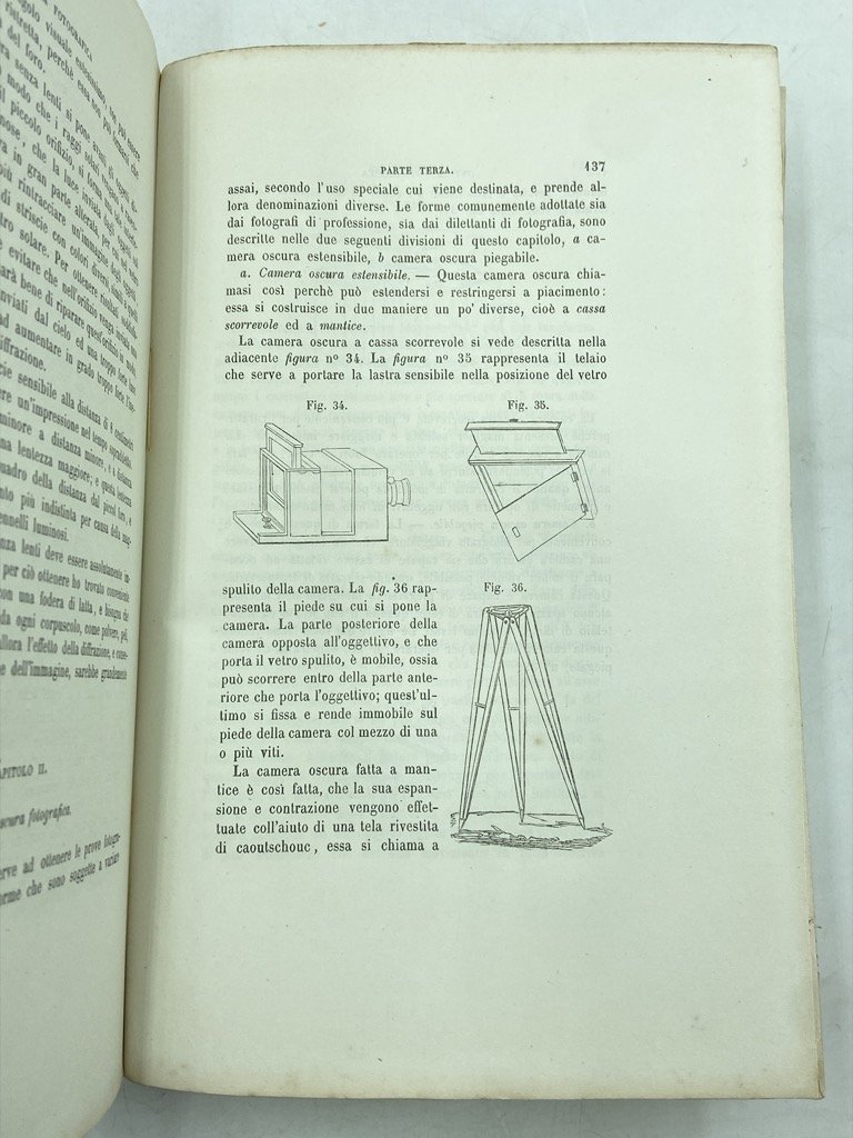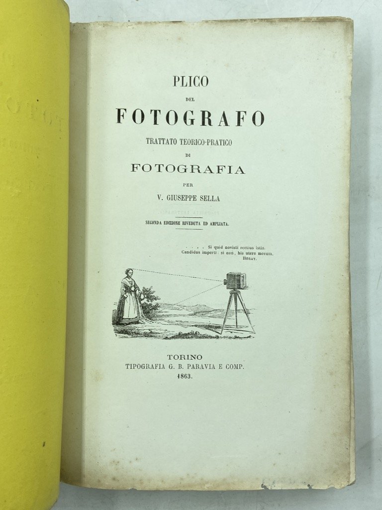 Brossura editoriale a stampa, 8vo cm 16x25, pp XV (1) 500; vignetta sul frontespizio, 53 figure in nero nel testo e una tabella con campioni di colore applicati. Esemplare intonso e del tutto editoriale, lievi segni del tempo sulla brossura (strappi della leggera carta della copertina professionalmente riparati), piccola macchia d'inchiostro sul margine inferiore della pagina 225/226, e tenue gora lungo il margine esterno delle ultime 5 segnature, alta circa 10cm e larga al massimo 1cm dal bordo della pagina. Buona copia. Seconda edizione, ampliata di circa 80 pagine rispetto alla prima del 1856 che portava il sottotitolo di «Arte pratica e teorica di disegnare uomini e cose sopra vetro, carta, metallo, ecc. col mezzo dell'azione della luce», del primo trattato italiano dedicato alla fotografia (Castronovo, DBI). L'opera si apre con un'introduzione dedicata alla storia della camera oscura e della fotografia, con note sulle diverse tecniche e ritrovati di Niepce, Talbot, Daguerre, Wedgewood e Davy; a questa prima parte seguono i tre libri che compongono il trattato: il primo, «Ottica applicata alla fotografia», tratta della luce, delle lenti, degli obiettivi fotografici (con note su Sutton e Porro), delle camere oscure stenopeiche, fotografiche e da copiatura, delle lanterne magiche, degli apparecchi stereoscopici; il secondo libro, “Chimica applicata alla fotografia”, analizza i reagenti chimici e le carte; il terzo libro, “Procedimenti fotografici”, è dedicato alla produzione dei negativi all’albumina e al collodio su lastra e carta, al dagherrotipo, e a numerosi procedimenti fotografici (Anfitipia, Bromidragirotipia, Catalissotipia, Cianotipia, Crisotipia, Cromotipia, Cipro-bismotipia, Fluorotipia, Piombotipia, Uranotipia). Giuseppe Venanzio Sella si dedicò fin dalla gioventù agli studi chimici, stimolato dalla necessità di adeguare l’opificio tessile di famiglia alle necessità della moderna industria tintoria; l’interesse per la chimica e la frequentazione degli esposizioni internazionali lo portarono anche a muoversi - tra i primi in Italia - nell’ambito della fotografia, sviluppando rapidamente una biblioteca sull’argomento e iniziando a produrre immagini già nel 1848. Nel 1856 pubblicò la prima edizione di questo suo “Plico del fotografo”, pionieristico trattato di chimica e tecnica fotografica che conobbe immediato successo internazionale e fu tradotto in francese nei manuali Roret.