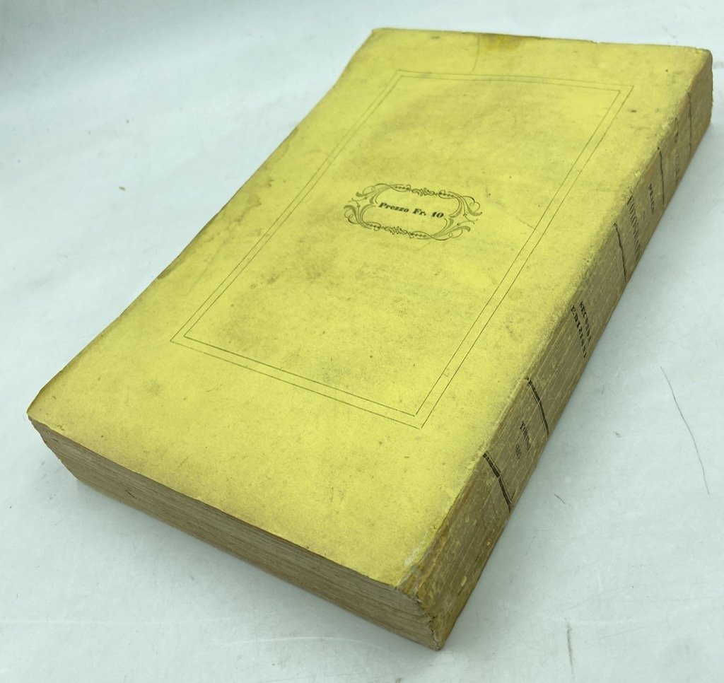 - Esemplare intonso e del tutto editoriale, lievi segni del tempo sulla brossura (strappi della leggera carta della copertina professionalmente riparati), piccola macchia d'inchiostro sul margine inferiore della pagina 225/226, e tenue gora lungo il margine esterno delle ultime 5 segnature, alta circa 10cm e larga al massimo 1cm dal bordo della pagina. Buona copia.