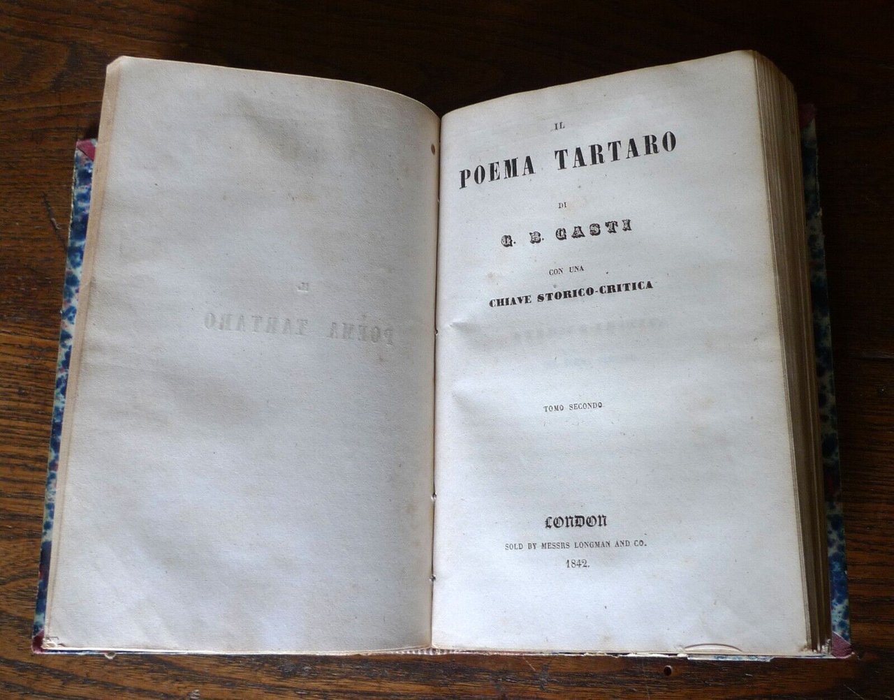 IL POEMA TARTARODI GIOVANNI BATTISTA CASTI.CON UNA CHIAVE STORICO-CRITICA.- TOMO PRIMO- TOMO SECONDO[2 TOMI RILEGATI IN UN UNICO VOLUME,OPERA COMPLETA].London, sold by Messers Longman and Co., 1842,copertina rigida, rilegatura coeva in mezza pelle, 17x11 cm., pp.X-349;320,peso: g.500