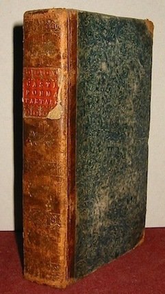 12mo (cm. 14,7), 2 Tomi in un Vol., 1 c.nn. (antiporta incisa), 240 pp.; 1 c.nn. (antiporta incisa), 233(1) pp., 3 cc.nn. Legatura coeva in mz. pelle con fregi e titolo oro su tassello in pelle al ds. Piccola mancanza al tassello e segni di usura al ds. e agli angoli. Carta azzurra. Buon esemplare.