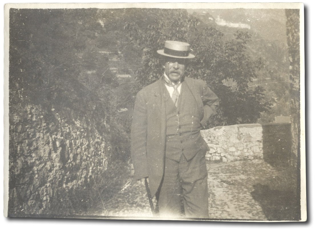>Fotografia in bianco e nero, al verso firma per esteso dello scrittore, in basso a destra '' Albogasio, 31/8/1910'', località della Valsolda dove, nel Piccolo Mondo Antico, Fogazzaro localizza l'incontro tra Luisa e la marchesa. Antonio Fogazzaro (Vicenza, 25 marzo 1842 – Vicenza, 7 marzo 1911) , fu nominato senatore del Regno d'Italia nel 1896. Dal 1901 al 1911 fu più volte tra i candidati al Premio Nobel per la letteratura, che tuttavia non vinse.