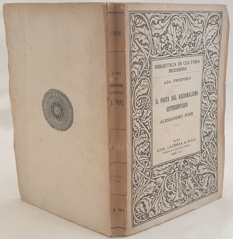 Edizione del 1943 di questa monografia sul poeta del razionalismo settecentesco Alexander Pope (1688-1744) a cura di Ada Prospero. Volume della collana "Biblioteca di cultura moderna". All'interno: istinti romantici e disciplina classica, il credo letterario, il volo poetico, la battaglia, il credo etico, l'umanità della satira ecc. In buone condizioni. Copertina editoriale in buone condizioni generali con lievi usure ai margini e dorso. Legatura in buone condizioni. Pagine in buone condizioni con fioriture. In 8. cm 20,5x13,5. Pp. 186+(2).Edition of 1943 of this monography about the poet Alexander Pope (1688-1744) by Ada Prospero. Volume of the series "Biblioteca di cultura moderna". In good conditions Editorial cover in good conditions lightly worn in the extremities. Binding in good conditions. Pages in good conditions with foxing. In 8. cm 20,5x13,5. Pp. 186+(2).