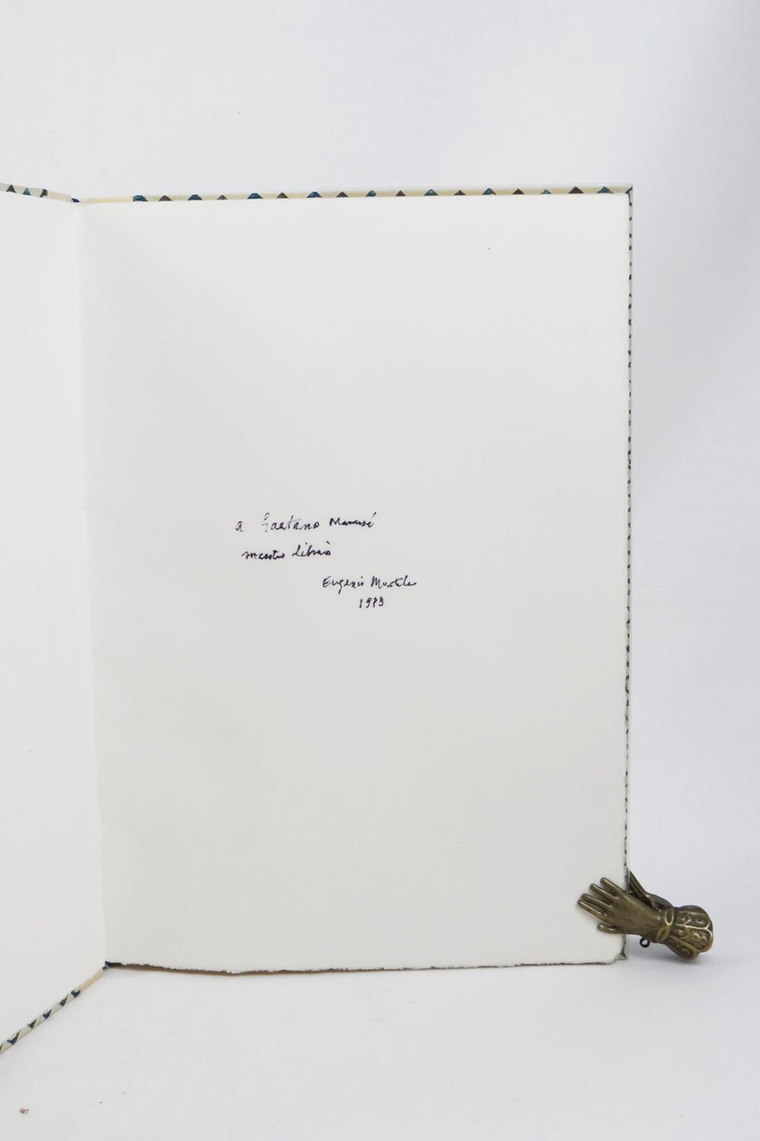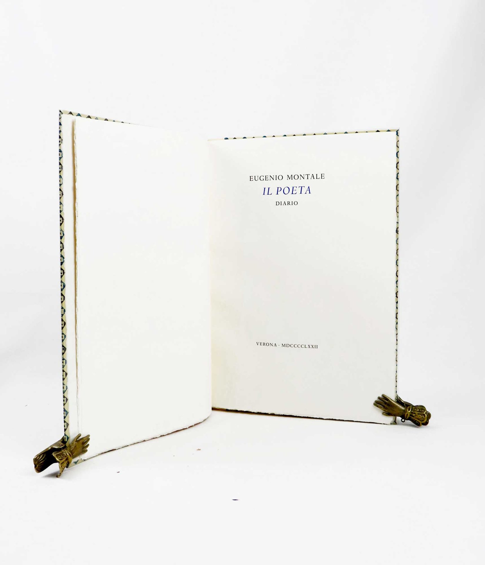 LIBROSeconda edizione, prima di lusso con copertina rigida.CON AUTOGRAFO.Esemplare numero 150 di 165 in ottime condizioni, completo dell’astuccio e dell’acetato originali. Firma autografa dell’autore al colophon.Nuova edizione della raccolta «Diario del ‘71», originariamente apparsa per Scheiwiller nel 1971 in soli cento esemplari. In questa edizione di pregio con tiratura complessiva di 165 esemplari numerati a stampa, la silloge di Montale - resa con il titolo «Il poeta. Diario» - è ricomposta dall’Officina Bodoni di Verona con carta a mano Magnani di Pescia in barbe e carattere Dante corsivo in una variante appositamente creata da Mardersteig.Bibl.: Barile, Bibliografia montaliana, pp. 31-32