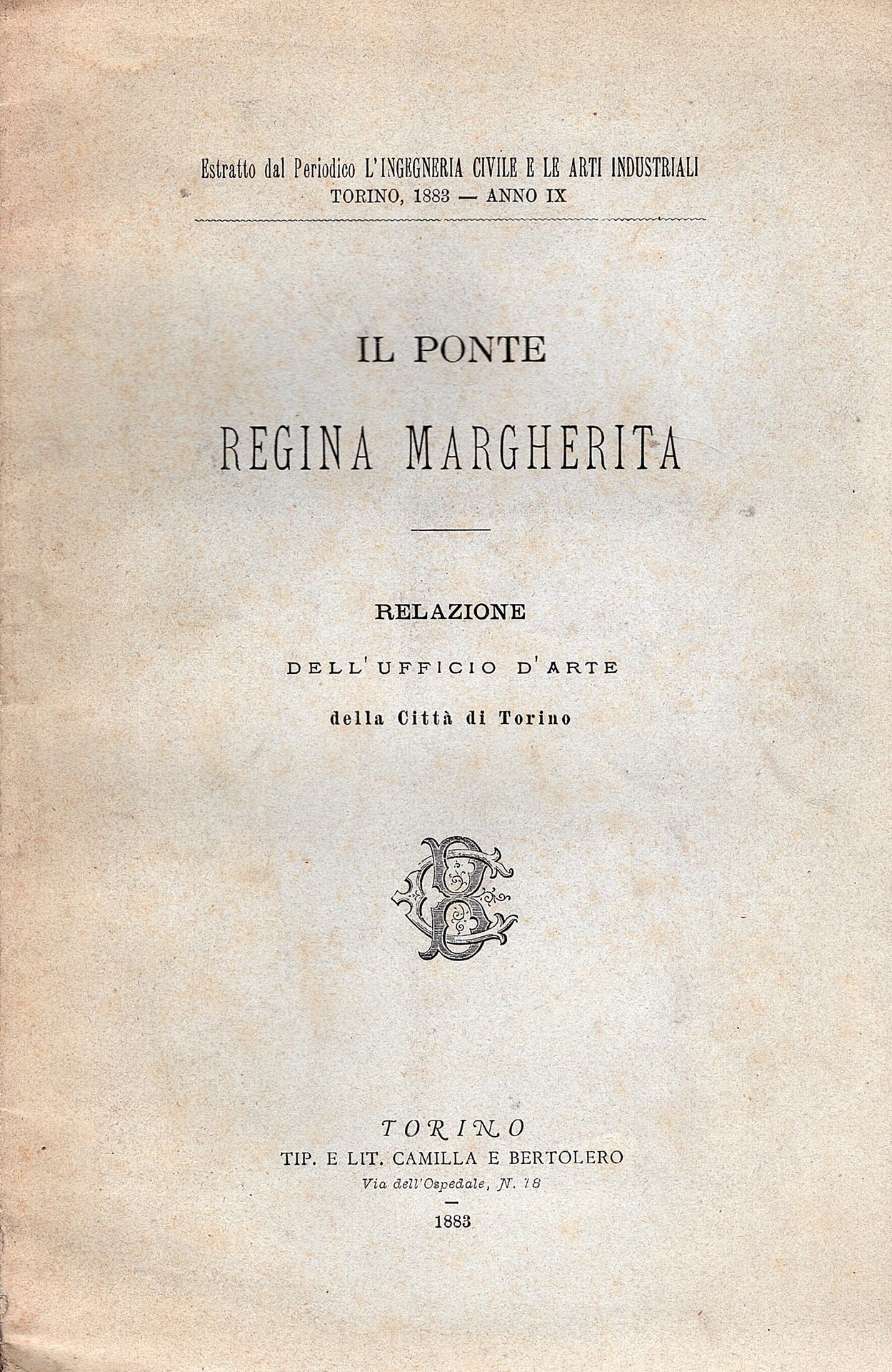 In-8° (23.5x15 cm), pp. 18, brossura editoriale con titoli in nero al piatto anteriore. In fine due tavole f/t finimente incise e ripiegate di prospetti, sezioni, archi, armature e ponte di servizio. Ottimo e genuino esemplare. Non comune memoria circa la progettazione e la costruzione del ponte Vanchiglia posto all'estremità nord-est della città (cinta daziaria) onorato coll' augusto nome di Regina Margherita essendo posto all'inizio del grandioso corso che si estende poi per cinque km fino alla barriera del Martinetto.