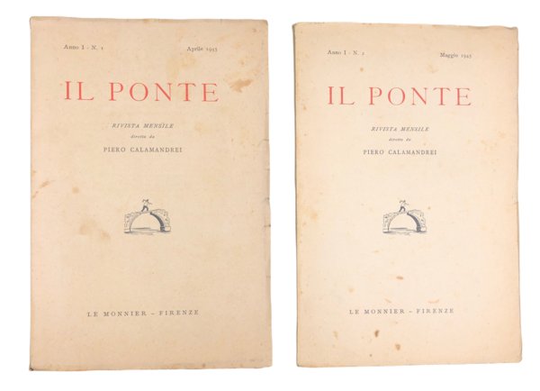 IL PONTE. Rivista mensile diretta da Piero Calamandrei. Anno I, nn. 1 (aprile 1945) + 2 (maggio 1945). [Programma della rivista, problemi della ricostruzione, Carlo LEVI "Cristo s'è fermato a Eboli" (21 pagine con brani in anteprima : "Gente di Lucania", "Il sanaporcelle", "La serva maga" e "Il morto nel pantano").