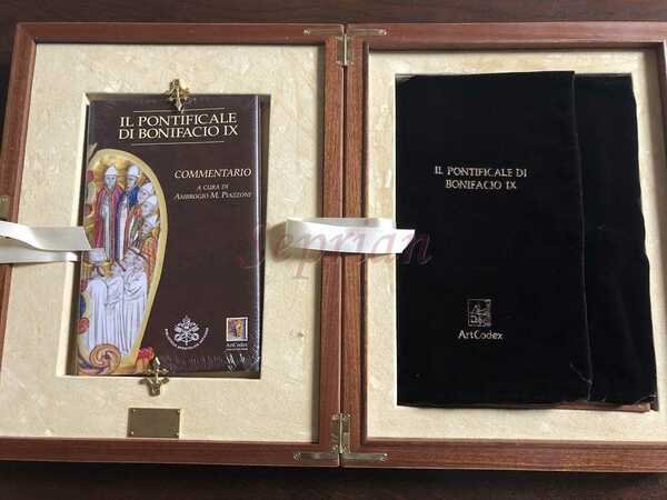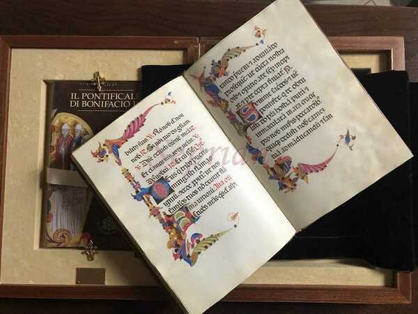 Un capolavoro d’arte medievale che si distingue dagli altri codici del suo tempo per la fantasia e creatività dei miniatori. Oltre alla bellezza artistica acquista notevole importanza la valenza storica: le immagini descrivono minuziosamente le cerimonie papali restituendo così al nostro tempo alcuni dettagli perduti sull’abbigliamento e gli accessori utilizzati nelle celebrazioni liturgiche del 1300. Commissionato alla fine del XIV secolo da papa Bonifacio IX questo manoscritto ha undici miniature a piena pagina, iniziali miniate e cornici decorate con colori vivaci e foglia d'oro. Il Pontificale di Bonifacio IX è composto da 88 pagine contenenti il rituale e le preghiere delle funzioni papali. Riproduzione integrale in oro zecchino 23,5 kt. Volume di formato 21x32 cm. pagine 104, legatura in pelle con lo stemma di Bonifacio IX inciso in oro. Cofanetto in legno pregiato. Commentario realizzato dal Comitato Scientifico e coordinato dalla Biblioteca Apostolica Vaticana. Tiratura 500 copie.