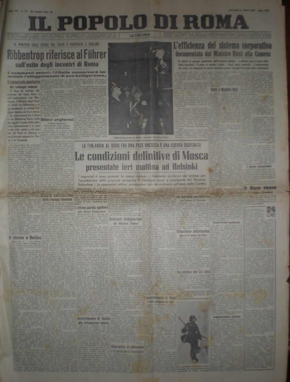 Giornale di cm 59 X 42, pp. 6. Pieghette, qualche inngiallitura, millimetrici strappetti e rare, millimetriche mancanze in corrispondenza delle pieghette. Articoli tra gli altri su: Ribbentrop riferisce al Fuhrer sull'esito degli incontri di Roma - L'efficienza del sistema corporativo documentata dal ministro Ricci alla camera - La Finlandia al bivio fra una pace onerosa e una guerra disperata, le condizioni definitive di Mosca presentate ieri mattina ad Helsinki - CRONACA DELL'UMBRIA: Umbria Mistica, la ultramillenaria processione di Monte Santa Maria - Una grande colonia permanente sorgera' sopra il Clitunno - TRAFILETTI (Antica mensola rinvenuta a Citta' di Castello - Rimini-Tifernno 1 a 0 - Arezzo-Foligno 1 a 0 .) - Bilancio della guerra navale - Italo Zingarelli: Incerte ore di attesa nella capitale finnica - (Foto, Von Ribbentrop con il suo seguito nelle Loggiate Vaticane dopo l'udienza pontificia)