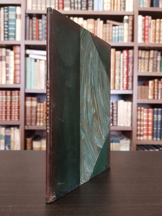 In-8° (cm. 20), legatura d'amatore in mezza pelle verde ad angoli con titolo in oro al dorso (lievissime tracce d'uso), conservata la brossura originale rosa con titolo in nero; pp. 7 [1] in stato molto buono (alcune macchiette); 1 tavola ripiegata fuori testo con la pianta del porto. Edizione non comune, di grande interesse dannunziano. Esemplare molto buono. (NB5)