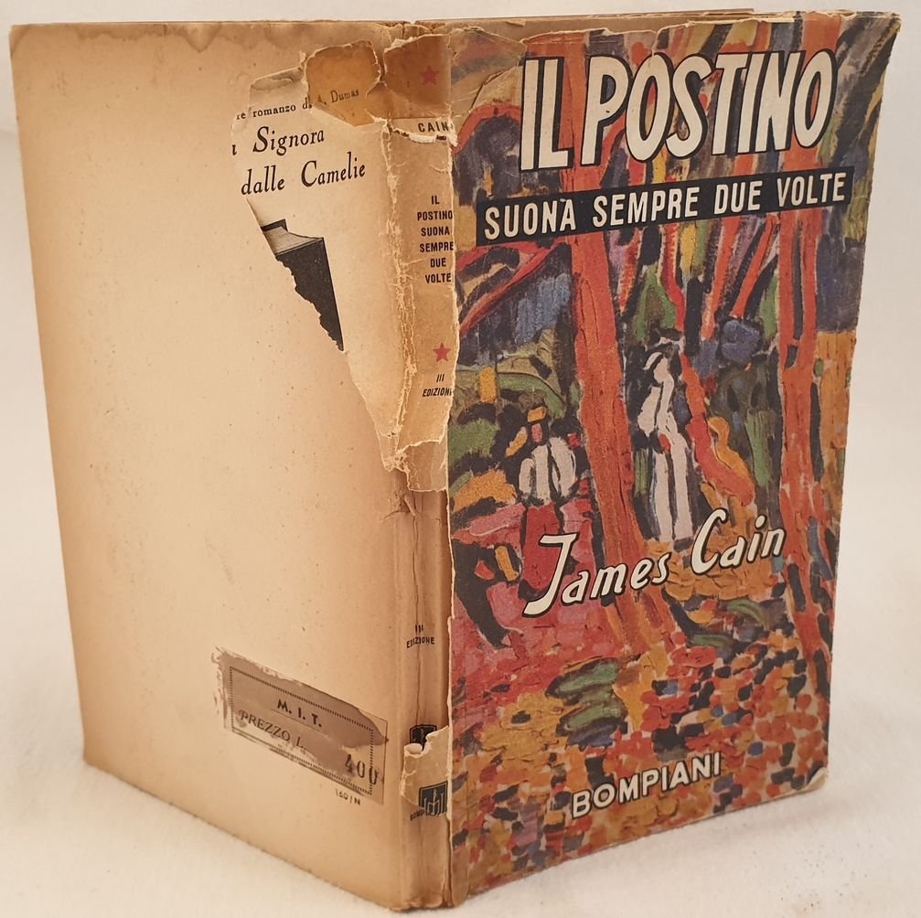 Terza edizione del 1947 del celebre romanzo del giornalista americano James M. Cain (1697-1767). Sovraccoperta originale. In discrete condizioni. Copertina editoriale con sovraccoperta in discrete condizioni generali con usure e parti mancanti ai margini e dorso. Legatura in buone condizioni. All'interno le pagine si presentano in ottime condizioni con rare fioriture. In 8. Dim. 20,5x12,5 cm. Pp. 157+(2).Third edition of 1947 of the famous novel by the amercian journalist James M. Cain (1697-1767). Original dustjacket. In fair conditions. Editorial cover with dustjacket in fair general conditions with wearing and missing parts in the edges and spine. Binding in good conditions. Inside pages are in very good conditions with occasional foxings. In 8. Dim. 20,5x12,5 cm. Pp. 157+(2).