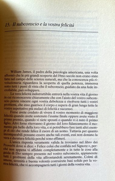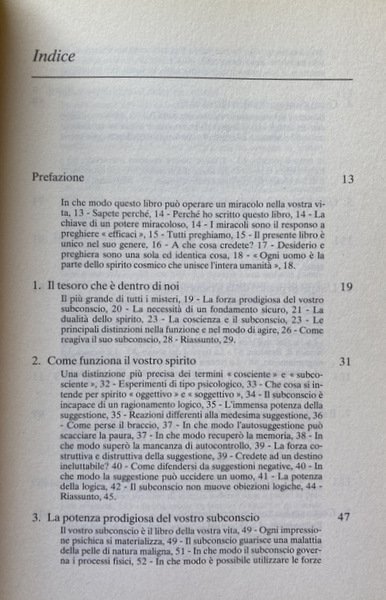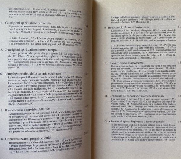 Soggetti: Poteri della mente, Guarigioni spirituali, Studi parapsicologici, Stati di coscienza, Antichità, Realizzare i propri obiettivi, Subconscio, Energia mentale, Famiglia, Salute, Benessere interiore, Felicità, Realizzazione, Amore, Tecniche scientifiche, Training autogeno, Cure alternative, Cervello, Placebo, Vita quotidiana, Mettere in pratica, Concetti, Potere, Capire, Pensieri positivi, Ottimismo, Donna ideale, Uomo ideale, Matrimonio, Successo, Carriera, Coscienza, Consapevolezza, Fede, Guarigioni, Forze mentali, Malattie, Ricchezza, Denaro, Miracoli, Preghiere, Spiritualità, Desiderio, Inconscio, Spirito, Subcoscienza, Memoria, Guide pratiche, Esempi, Storie vere, Suggestioni, Psiche, Dinamiche, Relazioni, Somatizzazione, Male, Negatività, Bibbia, Antico Testamento, Parabole, Teologia, Teorie, Paracelso, Esperimenti, Tumori, Cancro, Bernheim, Stigmate, Santi, Potere curativo, Mani, Pellegrinaggio, Tecnica, Baudoin, Terapie, Sonno, Ipnosi, Ringraziamento, Prova, Azione, Obiettivi, Armonia, Vitalità, Effetto contrario, Affari, Insuccessi, Scienziati, Guadagnare, Dormire, Risposo, Ambiente, Amicizia, Mariti, Mogli, Sessualità, Tradimento, Adulterio, Perdono, Convivenza, Stabilità affettiva, Vizio, Dipendenza, Fortuna, Abbondanza, Paura, Liberazione, Giovinezza, Vecchiaia, Migliorarsi, Manuali, Misteri, Dio, Poteri divini, Depressione, Conflitti, Fantasia, Fedeltà, Filosofia di vita, Anima, Pace, Se stessi, Libri utili, Libri fuori catalogo, Consultazione, Riferimento, Illuminazione, Fenomeni psichici, Parapsicologia, Formule semplici, Riti, Concentrazione, Problemi, Autosuggestione, Cambiamenti, Pensiero positivo, Gesù, Bestsellers, You Can Change Your Whole Life, James Allen, Napoleon Hill, Dale Carnegie, Norman Vincent Peale, Scrittori motivazionali, Tony Robbins, Zig Ziglar, Earl Nightingale, Marital Problems, Mental Healings, Ancient Times, Tendency, Lifeward, Ernest Holmes, Scienza Religiosa, New Thought, Trascendentalismo americano, Congregazioni, Prentice Hall, Aiuto, Powers of the mind, Spiritual Healings, Parapsychological studies, States of consciousness, Antiquity, Achieve one's goals, Subconscious, Mental energy, Family, Health, Inner well-being, Happiness, Achievement, Love, Scientific techniques, Alternative treatments, Brain, Daily life, Concepts, Power, Understand, Positive thoughts, Optimism, Ideal woman, man, Marriage, Success, Career, Consciousness, Awareness, Faith, Mental forces, Illnesses, Wealth, Money, Miracles, Prayers, Spirituality, Practicing, Desire, Unconscious, Spirit, Subconsciousness, Memory, Practical guides, Examples, True stories, Suggestions, Psyche, Dynamics, Relations, Somatization, Evil, Negativity, Bible, Old Testament, Parables, Theology, Theories, Paracelsus, Experiments, Tumors, Cancer, Stigmata, Saints, Healing power, Hands, Pilgrimage, Technique, Therapies, Sleep, Hypnosis, Thanksgiving, Test, Action, Goals, Harmony, Vitality, Reverse effect, Business, Scientists, Earning, Sleep, Rest, Environment, Friendship, Husbands, Wives, Sexuality, Betrayal, Adultery, Forgiveness, Cohabitation, Affective stability, Vice, Dependence, Luck, Abundance, Fear, Liberation, Youth, Old age, Improve yourself, Manuals, Mysteries, God, Divine powers, Depression, Conflicts, Fantasy, Fidelity, Philosophy of life, Soul, Peace, Self, Useful Out of print books, Consultation, Reference, Illumination, Psychic phenomena, Parapsychology, Simple formulas, Rites, Concentration, Problems, Autosuggestion, Changes, Positive Thinking, Jesus, Motivational Writers, Religious Science, American Transcendentalism, Congregations, Practical Help