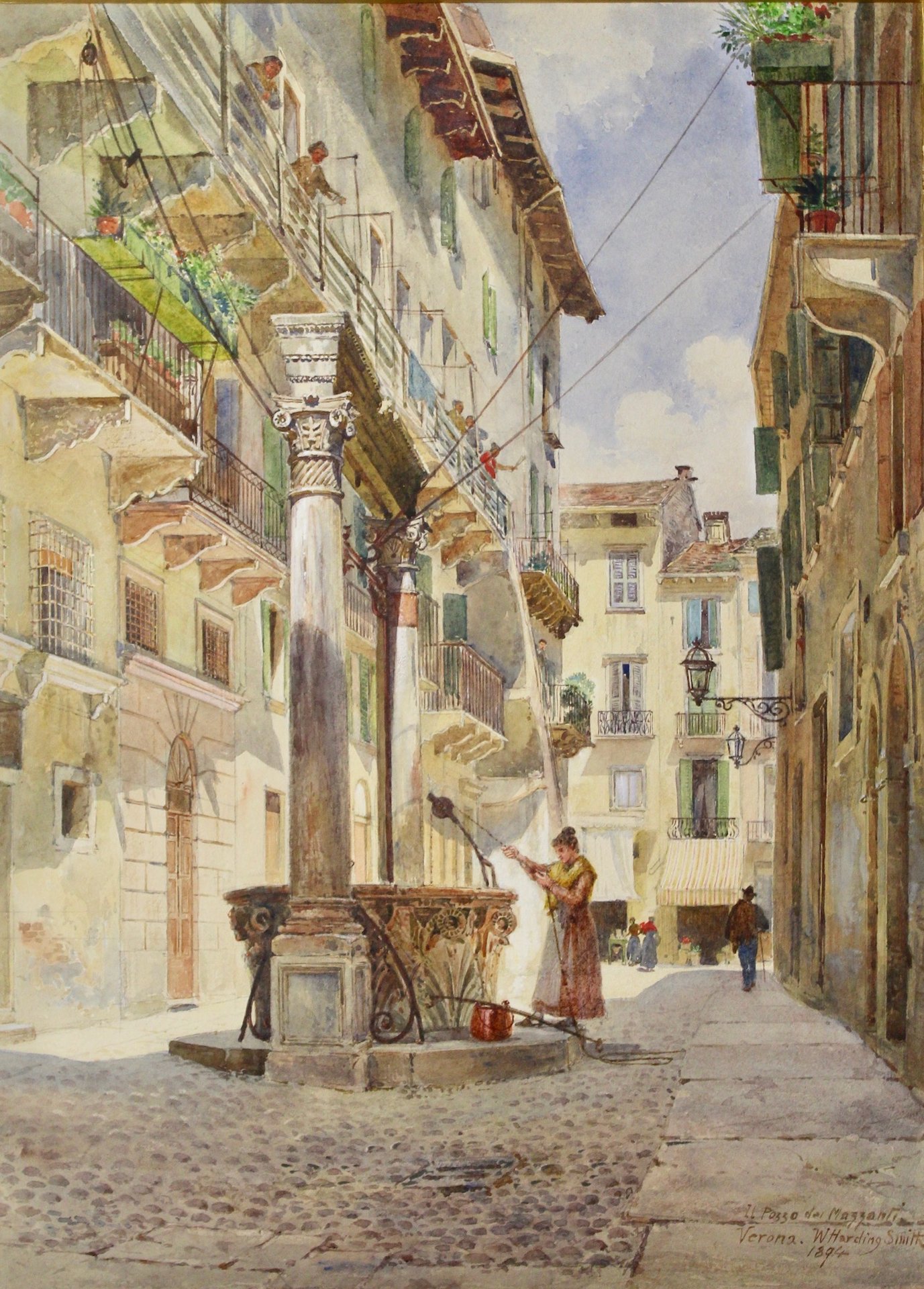Acquerello policromo firmato e titolato in basso a destra "Il Pozzo dei Mazzanti. Verona. W. Harding Smith. 1894", mm 480x350, eseguito su cartoncino, proposto con passe-partout dorato coevo a cui è fissato con poche tracce di colla. Gradevole scorcio della via Mazzanti con il pozzo in primo piano, animato da una popolana intenta ad issare un secchio di acqua, mentre altre figure femminili osservano dall'alto ed un uomo si avvia verso Corso Santa Anastasia. L'autore, artista inglese autore di numerose opere di genere vedutistico, nacque nel 1848 e morì nel 1922. Il nome completo era William Harding Collingwood Smith. <BR>Perfettamente conservato. <BR>