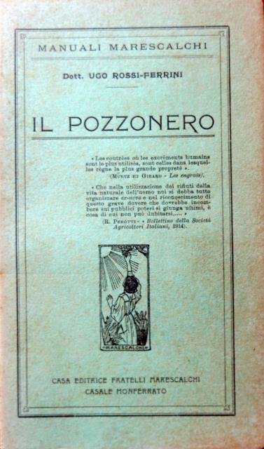 Casa Editrice Fratelli Marescalchi, Casale Monferrato, 1920. Manuali Marescalchi. In 8vo, pp. 186 + (2) edit., tabelle e ill. dis. in b/n n. t., leg. edit. in carta verde. Si prendono in considerazione tutti i vari aspetti legati all'argomento, da quelli umani a quelli di gestione e di smaltimento, anche in campo agrario: fosse fisse, fosse mobili, sostanze fecali umane, loro preparazione industriale, dispersione dell'azoto, uso del pozzonero in agricoltura. Non comune. Tagli ingialliti ma ottima conservazione.