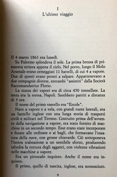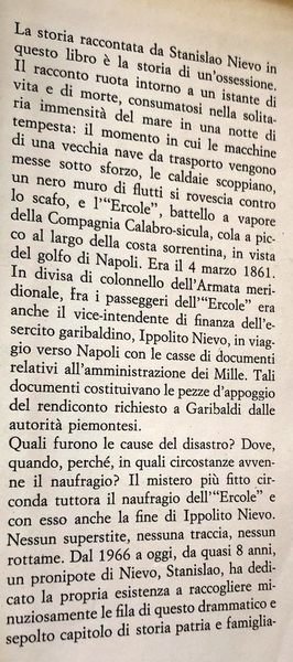 Soggetti: Biografie, Memorie, Racconti autobiografici, Storia d'Italia, Memoriali, Risorgimento, Unità, Unificazione, Storia patria, Vicende storiche, Romanzi storici, Reportage, Inchieste, Morte, Misteri, Naufragio, Ippolito Nievo, Diario di bordo, Contabilità, Parapsicologia, Primi anni Dieci, Vascello Ercole, Sorrento, Viaggio, Garibaldini, Savoia, Regno di Napoli, Sbarco dei Mille, Sicilia, Giubbe rosse, Avventura, Gialli, Storie vere, Destra storica, Piemonte, Strage di Stato, Potere, Sinistra garibaldina, Libri Vintage, Fuori catalogo, Bestsellers, Scomparse, Sparizioni, Patrioti italiani, Quarto, Spedizione, Nino Bixio, Cesare Abba, Giovanni Acerbi, Lettere garibaldine, Documenti amministrativi delle spese, Capitano Maiolini, Salviati, Scritturale Fontana, Complotto politico, Attentato, Finanziamenti internazionali, Regno Unito, Piroscafi, Ottocento, Mar Mediterraneo, Registri contabili, Servizi segreti sabaudi, Casse, Banco di Palermo, Francesco Crispi, Intendente di finanza, Politici, Banchieri, Affaristi, Massoneria inglese, Notabili borbonici, Borboni, Punta Campanella, Auguste Picard, Armata Meridionale, Battelli, Biographies, Memoirs, Autobiographical tales, History of Italy, Memorials, Unification, Unification, Homeland history, Historical events, Historical novels, Investigations, Death, Mysteries, Shipwreck, Logbook, Accounting, Parapsychology, Early Ten years, Travels, Savoy, Kingdom of Naples, Disembarkation of the Thousand, Sicily, Red jackets, Adventure, True stories, Historical right, Piedmont, Massacre of State, Power, Left Garibaldi, Books out of print, Disappeared, Disappearances, Italian patriots, Expedition, Garibaldi letters, Administrative documents of expenses, Captains, Political plots, Attack, International financing, United Kingdom, Steamers, Nineteenth century, Mediterranean Sea, Accounting records, Savoy secret services, Cashiers, Finance manager, Politicians, Bankers, Businessmen, English Masonry, Bourbon Notables, Bourbons, Southern Army, Boats