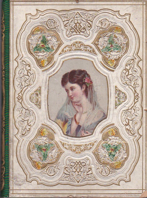 In-4° (264x190mm), pp. 176, cartonatura editoriale color avorio imitante la pergamena con ritratto poliromo di una dama al centro del piatto anteriore entro ricca bordura impressa in bianco, in oro e e in policromia a sbalzo con motivi floreali, ornamentali e geometrici. Dorso in tela verde con fregi in oro. Al piatto di tergo, una rosa impressa centralmente in policromia entro bordura a motivi floreali e ornamentali impressa a sbalzo in oro e in bianco. Tagli dorati. Testo entro bordura ornamentale monocroma. 3 tavv. incise su acciaio f.t. da vari artisti, di cui una con ritratto di Daniele Manin. Fioriture normali. Alcune abrasioni ai risguardi. In buono stato. La strenna raccoglie scritti in versi e in prosa di vari autori, fra i quali Vincenzo De Castro ('In morte di Vittorio Emanuele II', 'A Umberto Primo Re d'Italia', 'Pio Nono', 'Sul Duomo di Milano', ecc.), Tito Vignoli. Giuseppe Marco Bourelly (col contributo di esegesi dantesca 'Dante e Beatrice nel mondo della Luna' e con un saggio manzoniano, 'Sul ritorno di Lucia e Renzo dopo gli sponsali'), Michele Pappalardo, Mario Paganetti (con una biografia di Daniele Manin), Paolo Tedeschi, Carlo Cotta Morandini, Eliodoro Lombardi, Giuseppe Regaldi ('Il Canto del Tevere', ecc.), Giovanni De Castro ('Guendalina Borghese'), ecc. Figurano inoltre traduzioni da poeti antichi e moderni: Anacreonte, Beranger, Heine, Goethe. Baretta / Griffini, Strenne dell'800 a Milano, passim.