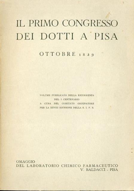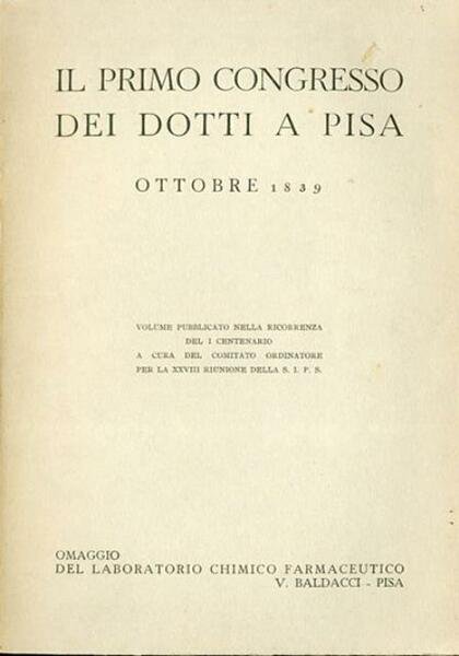 IV, 132 p., [16] carte di tav. : ritratti ; 25 x 18 cm. Carlo Luciano Bonaparte, principe di Canino e di Musignano, nipote di Napoleone e zoologo di fama internazionale, vista la felice riuscita dei congressi degli scienziati che si erano tenuti oltralpe, aveva contattato già dal 1838 il Granduca di Toscana Leopoldo II perché concedesse la città di Pisa come sede di un'esperienza analoga che avrebbe favorito il mutuo scambio di conoscenze e la collaborazione dei cultori italiani di scienze naturali. Titubante il sovrano per i sospetti che queste iniziative unificatrici suscitavano a Vienna, sul numero del 17 marzo 1839 della «Allgemeine Zeitung» il Bonaparte fece uscire la notizia della convocazione a Pisa per l'ottobre successivo di tutti i naturalisti italiani, costringendo di fatto Leopoldo II ad una sorta di patrocinio forzato. La condizione imposta fu che fossero bandite le scienze morali e la politica. Il Granduca, però, non ebbe a lamentarsi dell'andamento del congresso, che si tenne effettivamente a Pisa dal 1° al 15 ottobre 1839, senza tumulti o scandali, nonostante l'imponente dispiegamento di polizia e servizi segreti. L'immagine della Toscana come culla delle scienze naturali ne uscì anzi rafforzata, lungo un filo che portava dai Medici protettori di Galileo, a Pietro Leopoldo di Lorena sostenitore della funzione educativa e civilizzatrice della scienza, fino a Leopoldo II mecenate e garante delle riunioni scientifiche. Volume pubblicato nella ricorrenza del 1° centenario / a cura del comitato ordinatore per la 28. riunione della S.I.P.S. Sul frontespizio: Omaggio del Laboratorio chimico farmaceutico V. Baldacci, Pisa. Riproduzione anastatica di estratti dell'ed.: Pisa : Tipografia Nistri, 1840, col titolo: «Atti della prima riunione degli scienziati italiani tenuta in Pisa nell'ottobre del 1839». Brossura editoriale, coperta in cartoncino flessibile di colore grigio. Titolo impresso al piatto e al dorso. Qualche segno del tempo alla copertina e alle pagine interno (ingiallimento della carta e fioriture), per il resto esemplare integro. Codice libreria 7085.