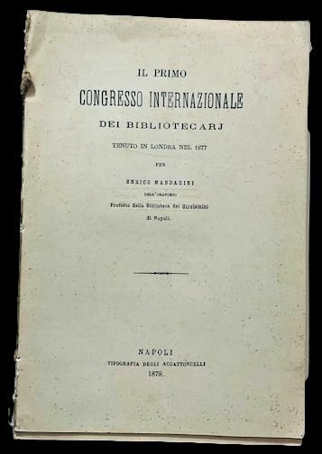 In 4°; 32, (2 su carta rosa con bibliografia delle altre opere di Anrico Mandarini) pp. Senza brossura ma non slegato. Prima edizione in forma singola (l'articolo era già apparso sul periodico "La Carità"), di questo scritto del Prefetto della Biblioteca dei Girolamini di Napoli dedicato al primo congresso internazionale dei Bibliotecari che si tenne a Londra nel 1877 nel quale vennero dibattuti i criteri di schedatura e organizzazione delle biblioteche del mondo.