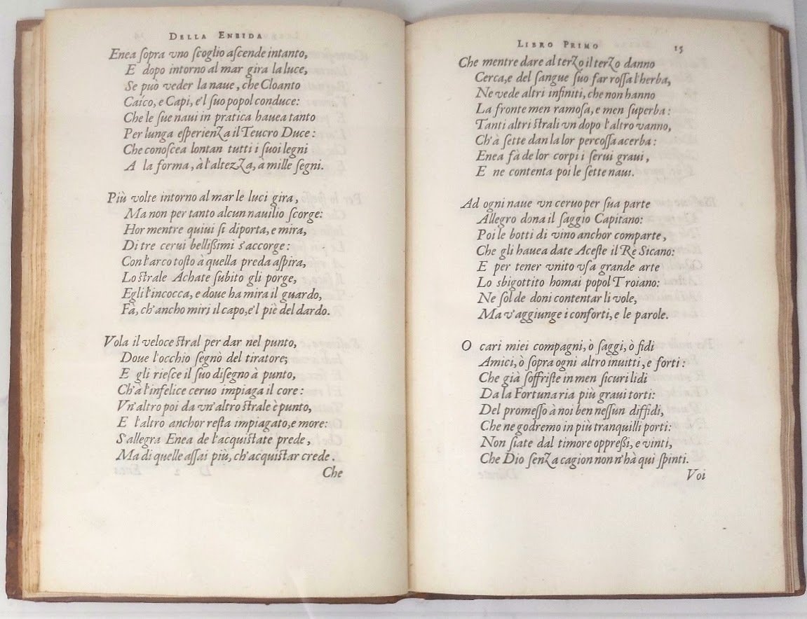 >in-4 (mm.247x165), ff. 47, (1), in magnifico carattere corsivo. Legatura settecentesca in piena pelle, titolo e fregi in oro su dorso a nervi (restauri alle cerniere). Stemma del Cardinal Madruzzo in xilografia al frontespizio, primo capolettera figurato. In una nota ms. al verso del foglio di guardia: "Il presente esemplare, di raro libro, è in carta grande. Esso apparteneva alla Collezione del Doge Marco Foscarini, giusta legatura di suo uso, e giusta la registrazione, sotto il n. 3093, nel volume intitolato Catalogo della Biblioteca Foscarini ai Carmini, vendibile a Venezia nell'anno 1800". La Biblioteca Foscarini, una delle collezioni private più antiche, ricche e importanti di Venezia, fondata dal doge veneziano Marco Foscarini, fu venduta per estinguere i debiti finanziari della famiglia Foscarini. Le condizioni di vendita, condotte da Antonio Nordio, procuratore generale della Casa Foscarini, sono riportate nel Catalogo (296 pp.) alle pagine vi-viii. I libri in vendita sono ordinati in ordine alfabetico per autore o titolo all'interno di sette categorie: autori greci e latini; autori italiani; autori francesi; autori spagnoli; autori inglesi; incunaboli; edizioni aldine. In fine al volume, la curiosa avvertenza a stampa: "Tutti coloro che ringratieranno l'Autore del dono almeno con parole, o' con lettere: saranno trovati da Enea nei Campi Elisi, dove saranno da Anchise lodati: gli altri per aventura si ritroveranno nel'inferno non senza colpa loro. La risposta si indirizzi à Venetia alla libreria della Sirena". Prima edizione di questo volgarizzamento del primo Libro dell'Eneide. Bell'esemplare, fresco e ad ampi margini. Mambelli 781; Gamba, 1740; BMC STC p. 731; manca ad Adams. Catalogo della vendita della celebre Biblioteca Foscarini, 1810.