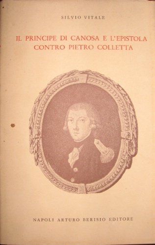 In-8° picc., pp. 258 con 1 ripr. di frontespizio n.t. e facsimile di giornale ripiegato più volte f.t. + pp. (1). Leg. edit. p. tl. verde acqua con tit. oro impresso al ds., sovr. avana ill. con ritr. in marrone del principe di Canosa, tit. rosso al piatto e al ds., sguardie su carta grigia.