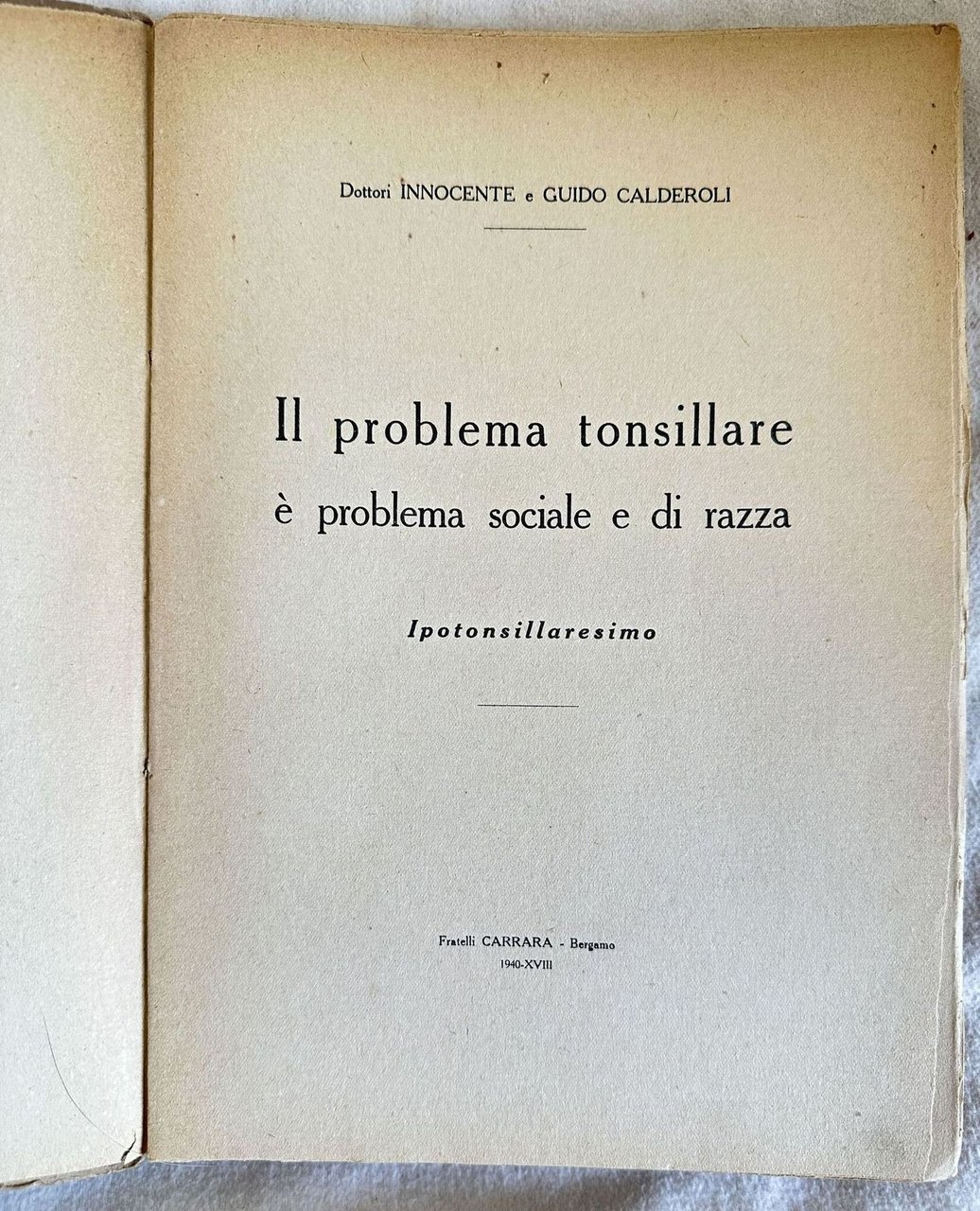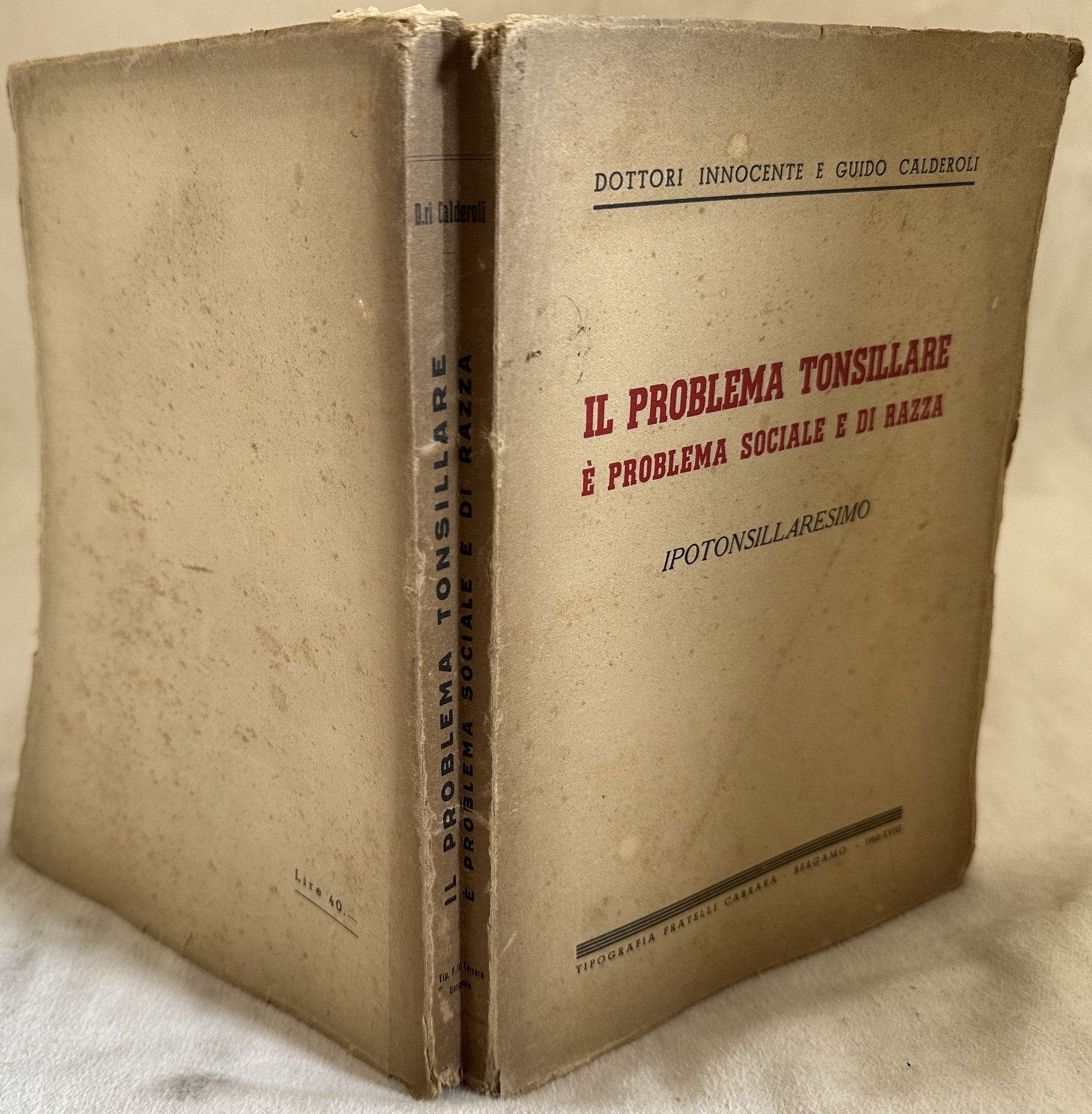 Edizione del 1940 di questo studio sull'ipotonsillaresimo legato ai problemi sociali e alla razza scritto da Dottori Innocente e Guido Calderoli. In buone condizioni. Copertina editoriale in buone condizioni con lievi usure marginali. Legatura in buone condizioni. Pagine in buone condizioni generali con fioriture. In 8. Dim. 25x18 cm. Pp. 254.Edition of 1940 of this study about ipo tonsils lied to social problems and race written by Dottori Innocente and Guido Calderoli. In good conditions. Editorial cover in good conditions lightly worn in the extremities. Binding in good conditions. Pages are in good conditions with foxing. In 8. Dim. 25x18 cm. Pp. 254.