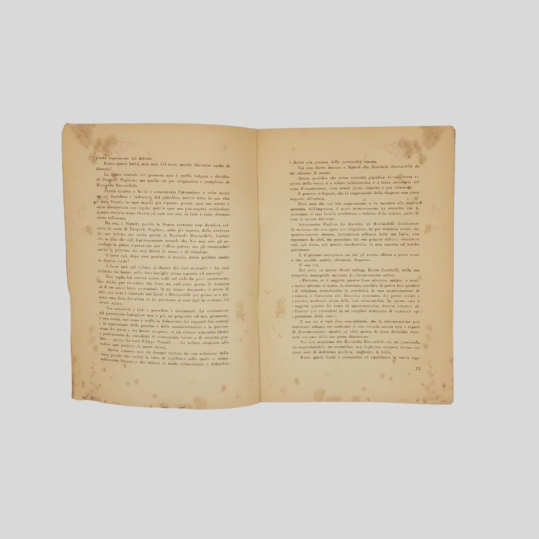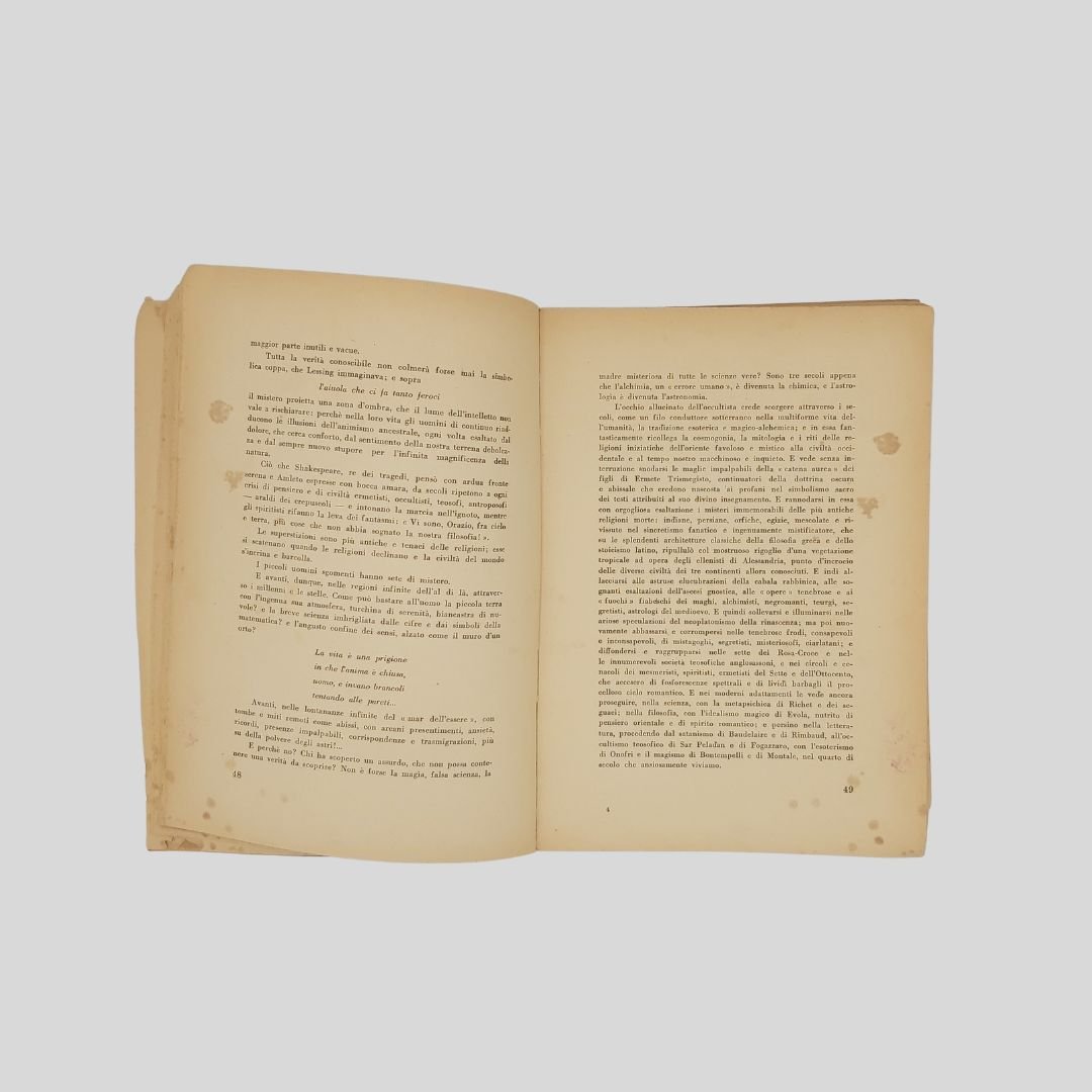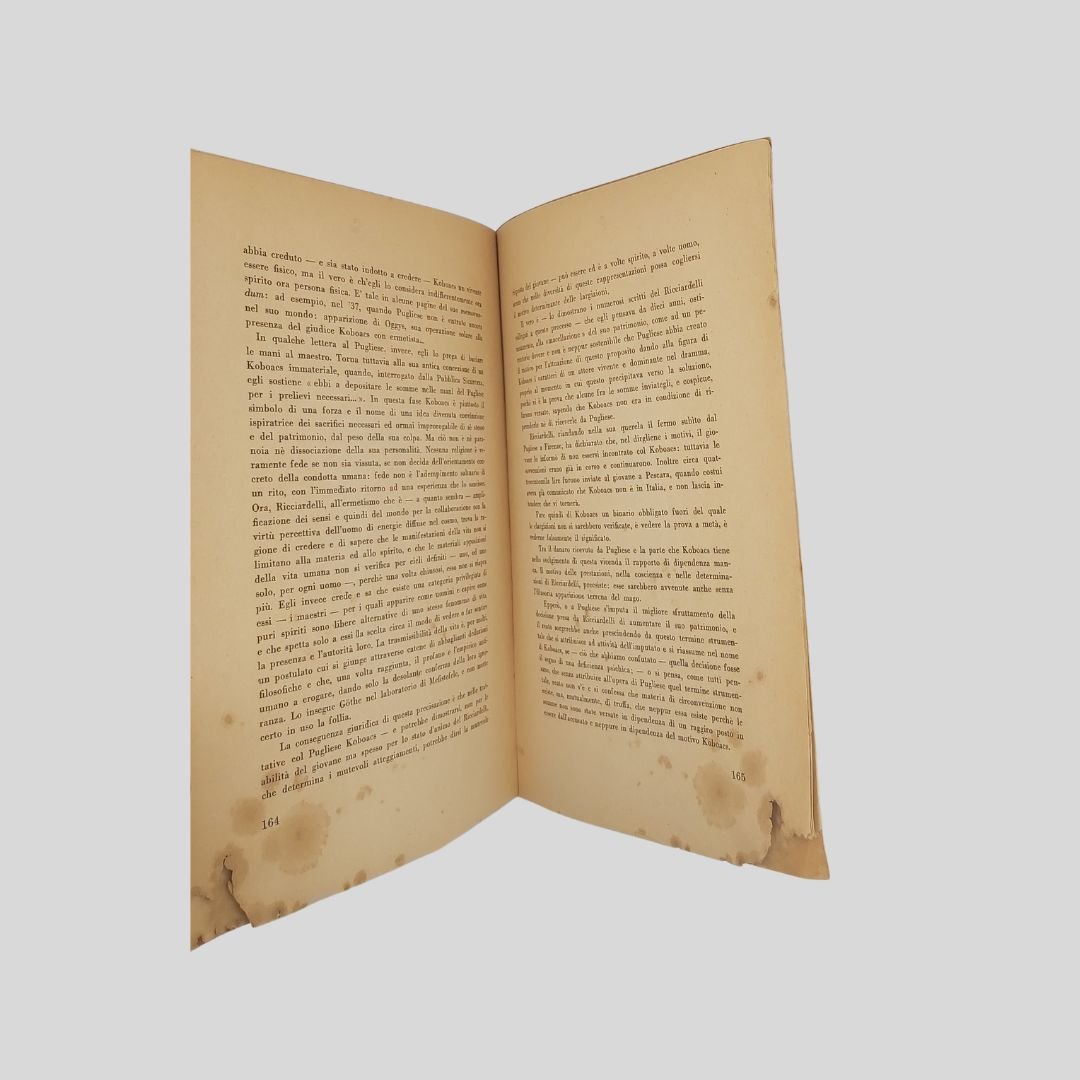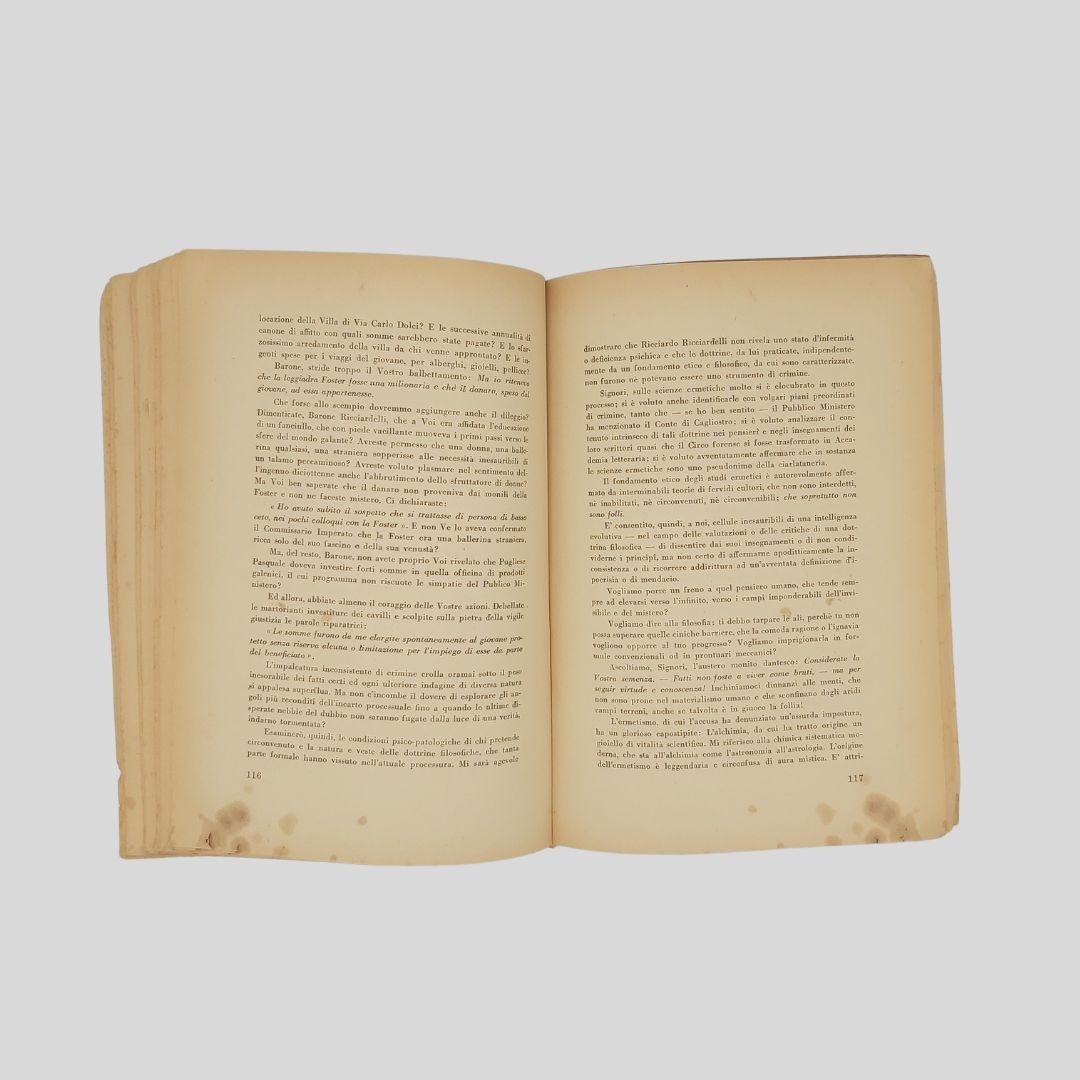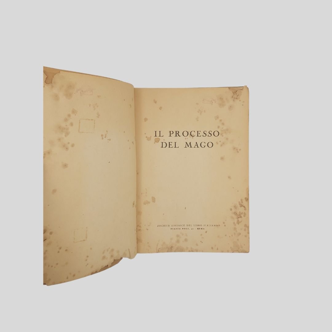 In-8° (cm 24 ca.), pp. 172. Presentazione di Libero Crifò. Scritti di: Adelmo Niccolaj (Arringa), difensore di parte civile; Francesco Polito-de Rosa (Requisitoria), Pubblico Ministero; Aleandro Di Stefano (Arringa), difensore dell’imputato; Alfredo De Marsico (Arringa), difensore dell’mputato. Copertina brunita con aloni e picc. mancanze senza perdita di testo alle prime 40 pagine e alle ultime 15; qualche buchetto ai margini bianchi, aloni e gore di vecchia umidità ai margini bianchi, pagina dell’indice staccata. Le pagine sono perfettamente leggibili. Esemplare non bello con dedica autografa all’occhiello di Aleandro De Stefano. Raro e introvabile volume pubblicato all’indomani dello svolgimento del processo contro Pasquale Pugliese (in arte Mago Koboaks) accusato di circonvenzione di incapace per aver sottratto ingenti somme di denaro al barone Ricciardelli, appassionato di esoterismo, carpendone la fiducia. Il giovane studente Pugliese era nipote di Giuliano Kremmerz la figura più rappresentativa dell’ermetismo magico italiano. Il mago Koboaks fu condannato a tre anni e due mesi e a una multa di diecimila lire. Condanna e multa furono condonate e fu rimesso in libertà. Il clamoroso processo svoltosi in pieno regime fascista (1941), cela una inquietante realtà ’’occulta’’ che scuote Roma e l’Italia dell’epoca. Molti interrogativi e segreti emersi dal’inchiesta non sono stati ancora risolti né divulgati. Immediatamente dopo la pubblicazione, il libro scompare dai circuiti librari, fino a diventare letteralmente introvabile anche nei circuiti antiquari. Alcuni ipotizzano sia stato fatto sparire per evitare che una serie di sconcertanti rivelazioni e imbarazzanti confessioni divenissero di pubblico dominio…