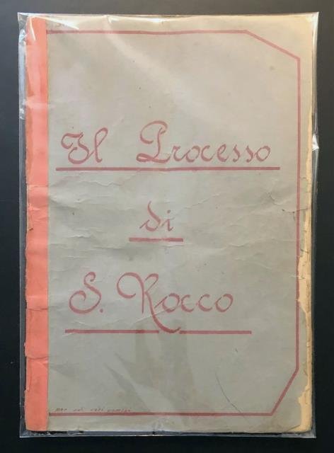 Fascicolo dattiloscritto rilegato in 4to (non datato ma al verso della copertina posteriore un timbro riporta la data del 27 ottobre 1950), composto di 30 pagine numerate e con brossura in carta grigio / azzurrina con titolo e costa in carta rossa. In minuta scrittura, in basso a sinistra della copertina anteriore, è scritto "per soli veri uomini". Un piega centrale e consunzione della copertina in carta, patina di sporco alla posteriore, ingiallimento fisiologico delle pagine ma completo e buono l'interno. Non si conoscono coeve pubblicazioni dell'opera e pertanto ciò che, molto raramente, di un po' più datato, appare sul mercato, sono composizioni ribattute e "casalinghe", o al massimo pubblicazioni realizzate per sottoscrizione con il divieto di essere messe in commercio dai librai (vedi avvertenza de "Un celebre processo", Edizioni del Bibliofilo, Lugano, tiratura limitata). Il "Processo a Don Sculacciabuchi di San Rocco" è un poema goliardico, composto verso la fine del diciannovesimo secolo, molto probabilmente in Toscana. L'autore è di fatto rimasto anonimo ma la sua composizione viene ormai attribuita unanimamente a Giovanni Rosadi (Lucca, 1862 - Firenze, 1925) avvocato, scrittore e politico italiano, all'epoca studente a Bologna, poi penalista e in seguito parlamentare. Laureatosi in giurisprudenza a Pisa, esercitò la sua professione di avvocato a Firenze; esponente della destra liberale, fu Segretario di Stato della Pubblica Istruzione, con la specifica funzione per le Antichità e Belle Arti, nei governi Salandra, Nitti e Giolitti; fu deputato dal 1900 al 1924, anno in cui venne nominato senatore. Precursore dell'ambientalismo, fu l'artefice, insieme a Benedetto Croce, della prima legge sulla protezione del paesaggio in Italia (n. 748, 1922). .