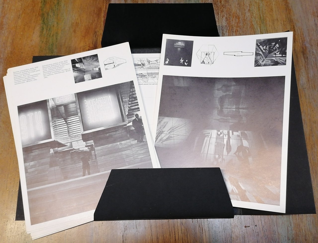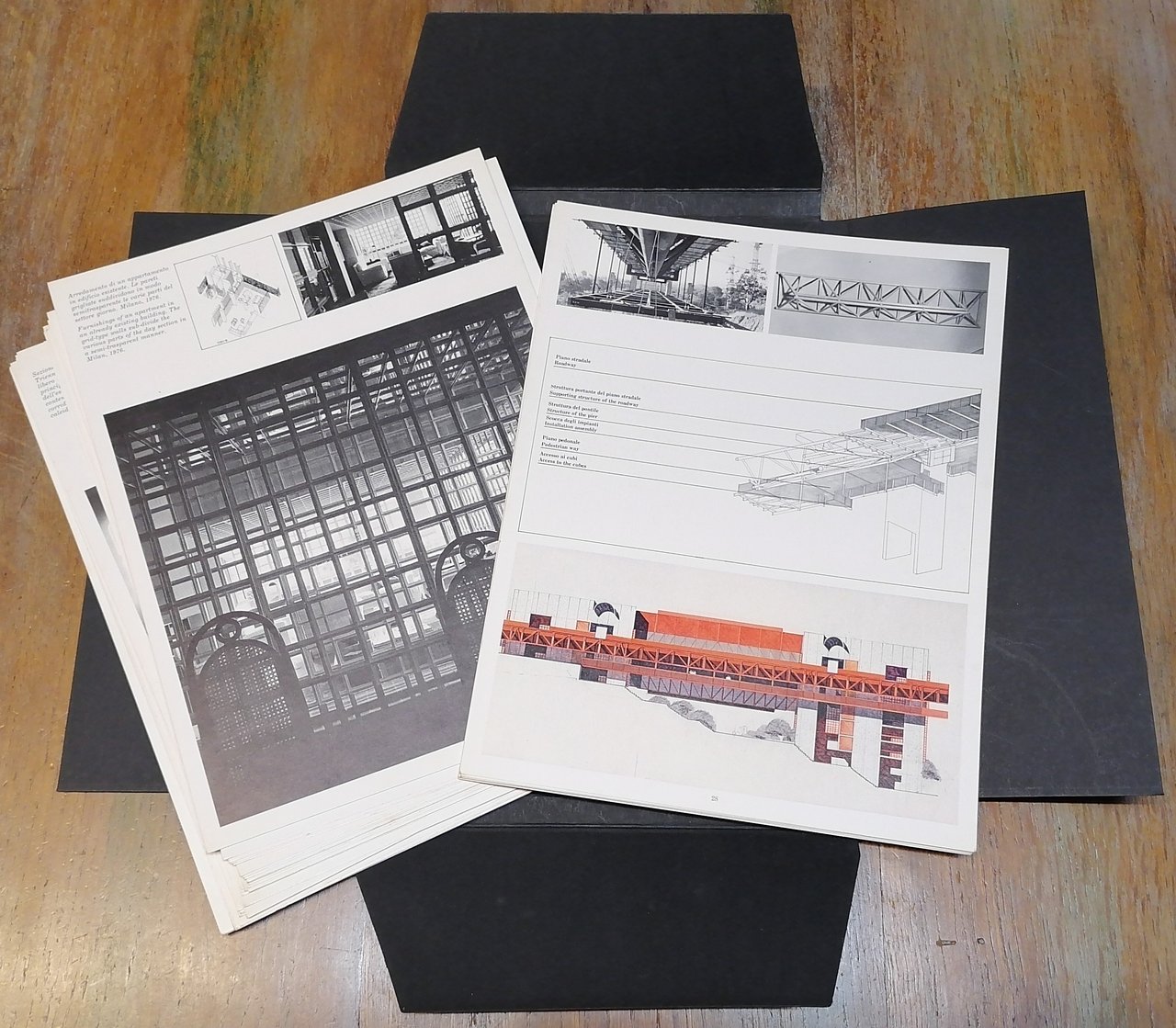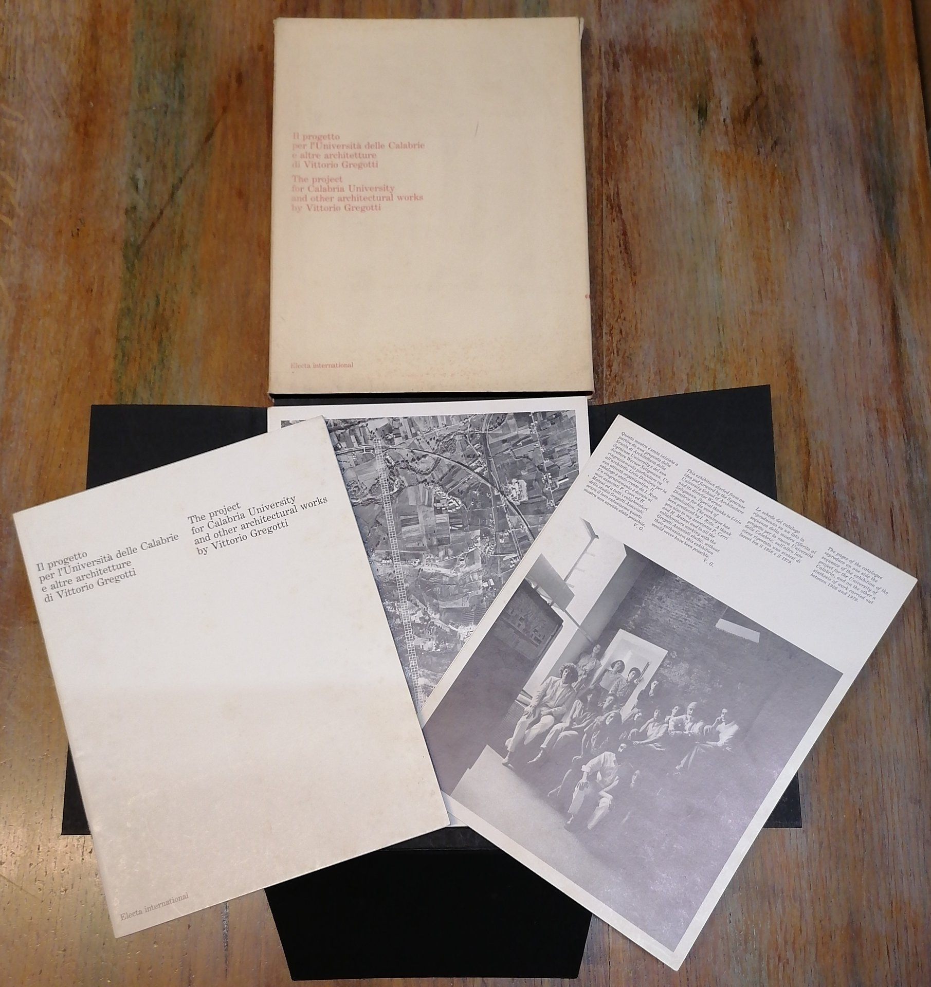Cm 29,5 x 22,5, cartella portfolio in cartoncino nero muto entro custodia in cartoncino bianco lucido con titoli in rosso, all'interno : una brossura di pp. XXX con testi di Manfredo Tafuri e Emilio Battisti in italiano ed inglese, 36 tavole sciolte di cui una con l'immagine fotografica dei collaboratori dello studio Gregotti Associati e 35 che riproducono al recto la sequenza della mostra riferita al progetto per la nuova Università delle Calabrie ed al verso una sintesi dei lavori dell'architetto Gregotti tra il 1956 e il 1979. Lievi tracce del tempo alla custodia, peraltro esemplare ben conservato.
