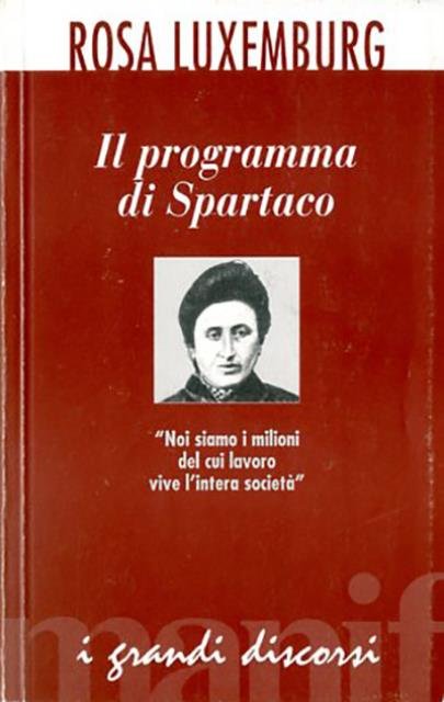 Ed. f.c. riservata ai lettori e abbonati de Il manifesto. 61 p. ; 17 x 11 cm. I grandi discorsi, 5. Il discorso pronunciato a Berlino il 31 dicembre 1918 al congresso di fondazione del Partito comunista tedesco (Lega di Spartaco) e l'autodifesa di Rosa Luxemburg al processo del febbraio 1914 per incitamento dei soldati alla disobbedienza. Introduzione di Rina Gagliardi. Ed. fuori commercio riservata ai lettori e abbonati del quotidiano «Il manifesto». Brossura editoriale, coperta illustrata in cartoncino flessibile plastificato e colorato. Timbro ex libris nel frontespizio per il resto esemplare integro. Codice libreria 8609.