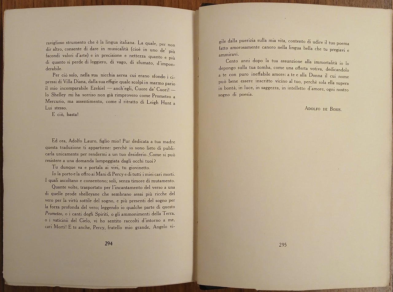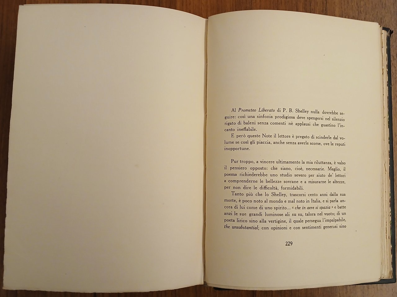 Il dramma “Prometheus Unbound” tradotto dall’inglese e commentato da Adolfo De Bosis. Volume in 8°, legatura coeva in piena pelle, dorso a cinque nervi con filetti e piccoli fregi dorati, ai piatti impressioni a motivo floreale entro cornice con filetti e dentelle dorate, carte di guardia decorate, taglio di testa marmorizzato (Legatoria Dante Gozzi e Figlio, Modena), pp. 295,(1). Bell’esemplare, in ottimo stato di conservazione.
