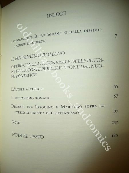 "DESCRIZIONE: Salerno Editrice Roma 2004, br. ed. con fig. a col. applicata la piatto, pp. 211 in 8°. Pubblicata anonima nel 1668, l'opera comprende due testi distinti, ma uniti nella tradizione editoriale: nel primo s'immagina che le cortigiane di Roma, allarmate dalla diffusione della sodomia in città, organizzino un conclave per eleggere alla successione di Alessandro VII un papa a loro favorevole, e a questo scopo passano al vaglio i piú noti cardinali dell'epoca; il secondo è un "Dialogo tra Pasquino e Marforio" sullo stesso argomento, ma in realtà rivolto a materie ancora piú compromettenti: il nepotismo, l'Inquisizione, l'infallibilità del papa. Dietro la denuncia dei cattivi costumi dei prelati, s'insinua la meno scanzonata riflessione sugli strumenti repressivi del potere, denunciati in nome di un'eterodossa libertà di pensiero. CONDIZIONI: Ottime/Perfette. PESO / WEIGHT: 300 gr. without package"
