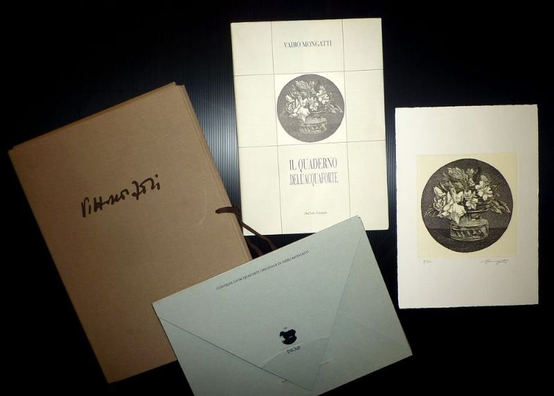 Custodia a cartella in tela editoriale, contenete altra cartella in brossura con il saggio sull'acquaforte, pp. 67 e una acquaforte originale dell'Autore numerata (9/90), e firmata. (Edizione in tiratura limitata e nelle prime 90 è allegata l'acquaforte originale) -(Vairo Mongatti, Firenze 1934. Allievo di Giuseppe Viviani e di Rodolfo Margheri, si è diplomato all’Accademia di Belle Arti di Firenze nel 1965, dove , dopo un periodo d’insegnamento alla Clementina di Bologna, assume la cattedra di tecniche dell’incisione.