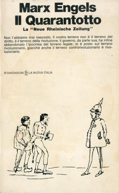 XXIII, 300 p. ; 21 x 13 cm. Dimensioni, 9. Dal 1° giugno 1848 al 19 maggio 1849, Marx ed Engels condussero sulle fitte colonne della «Neue Rheinische Zeitung» di Colonia una ardente battaglia per singere «fino in fondo» la rivoluzione democratica borghese, la «bella rivoluzione, la rivoluzione della fratellanza universale»; spingerla cioè fino a quel limite estremo delle sue possibilità e capacità di sovvertimento dell'ordine antico, oltre il quale (come diranno essi stessi nel 1850) si sarebbe trasformata in «rivoluzione permanente» avendo come protagonista unica la classe operaia. Tutti gli articoli pubblicati in questo volume sono stati tradotti dai voll. 5 e 6 dei «Werke», Berlin, Dietz, 1959 e 1960. Presentazione, traduzione e note di Bruno Maffi. Brossura editoriale, coperta illustrata (b/n) in cartoncino flessibile plastificato lucido. Codice libreria 9362.