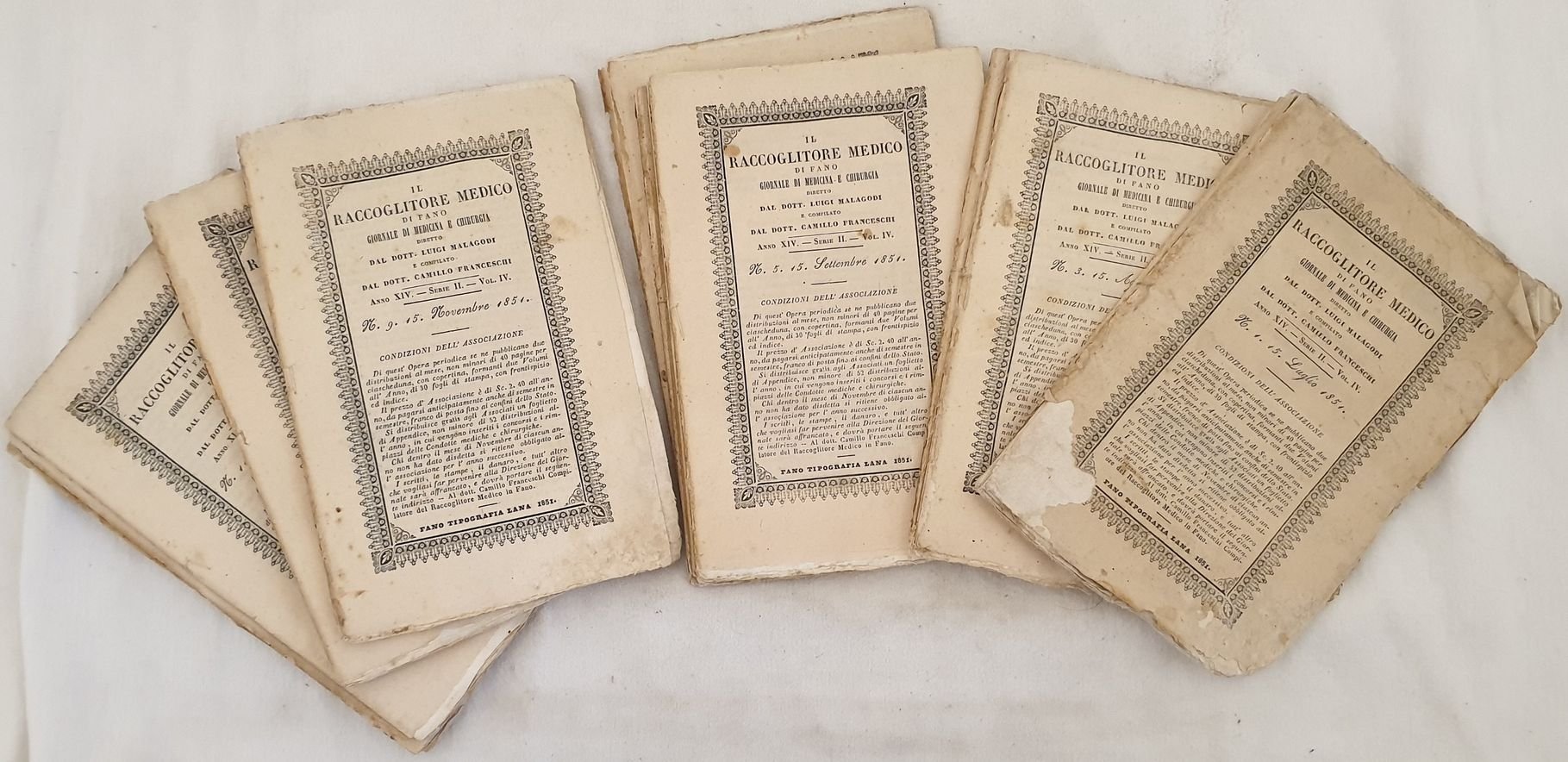 Secondo semestre 1851 della rivista marchigliana "Il raccoglitore medico" di Fano. Giornale di medicina e chirurgia diretto da Luigi Malagodi e compilato dal Dott. Camillo Franceschi. Siamo in possesso di 12 numeri numerati dall'1 all 12. La brossura del fascicolo 12 è la copertina di tutta l'annata. All'interno: Sulla purulenza spontanea del sangue, Dell'ano artificiale, Avvelenamento con la nicotina, Teoria dell'epilessia, caso straordinario di cadutra per l'ano del tenue intestino, Del Favo: considerazioni del Dottor Francesco Santini chirurgo a Cantarano, dei buoni effetti del narciso nell'isteria e nell'epilessia, Osservazioni pratiche su alcune malattie dell'utero, Fatti pratici comprovanti l'utilità delle iniezioni di tintura alcoolica di iodio nella cura di alcune malattie chirurgiche nell'ospedale Sant'Orsola di Bologna, Lussazione dell'articolazione cono femorale, Un amputazione di coscia per cancrena spontanea, Descrizione della frattura al cranio causa della morte, Sifitizzazione nell'uomo, Mercurio inutile nel trattamento dei male venerei primitivi, rottura della membrana timpanica, Alcuni casi di cataratta, induzione elettro dinamica, Compendio di farmacologia veterinaria e di alcuni altri relativi soccorsi Terapeutici di Rommaso Bonaccioli a Ferrara, Pneumonite nell'Ospedale di Tolentina, Di alcuni caratteri della medicina infantile, Dell'inefficacia dell'arsenico, delle cura radicale delle ernie, Relazione della malattia per cui mori Giuseppina Atti di Cento, Della vaccina e della inoculazione, Applicazione dell'elettricità al diagnostico, Sifilide, Malattie del cuore, Della grippe epidermica, eclampsia nella gravidanza e nel parto, Nei rapporti fra la mania suicida con il suicidio ecc. In buone condizioni. Copertina editoriale in buone condizioni con usure e mancanze ai margini e dorso. Qualche brossura in parte staccata. Legatura in buone condizioni. Pagine in buone condizioni con rare fioriture. Alcune gore d'umdità marginali. Alcune parti mancanti. Parti mancanti al primo fascicolo. In 8. cm 21,5x14. Pp. 480.Second semestrial of 1851 of the magazine from Marche "Il raccoglitore medico" of Fano. Giornale di medicina e chirurgia diretto da Luigi Malagodi e compilato dal Dott. Camillo Franceschi. We only have the 12 numbered from number 1 to 12. The editorial cover of number 12 is the cover of the all year. In good conditions. Editorial cover in good conditions lightly worn with losses in the extremities. Some editorial cover partially detached. Binding in good conditions. Inside pages are in good conditions with occasional foxing. Some missing parts. Missing parts in the first pamphlet. Some dump stains in the extremities. In 8. cm 21,5x14. Pp. 480.