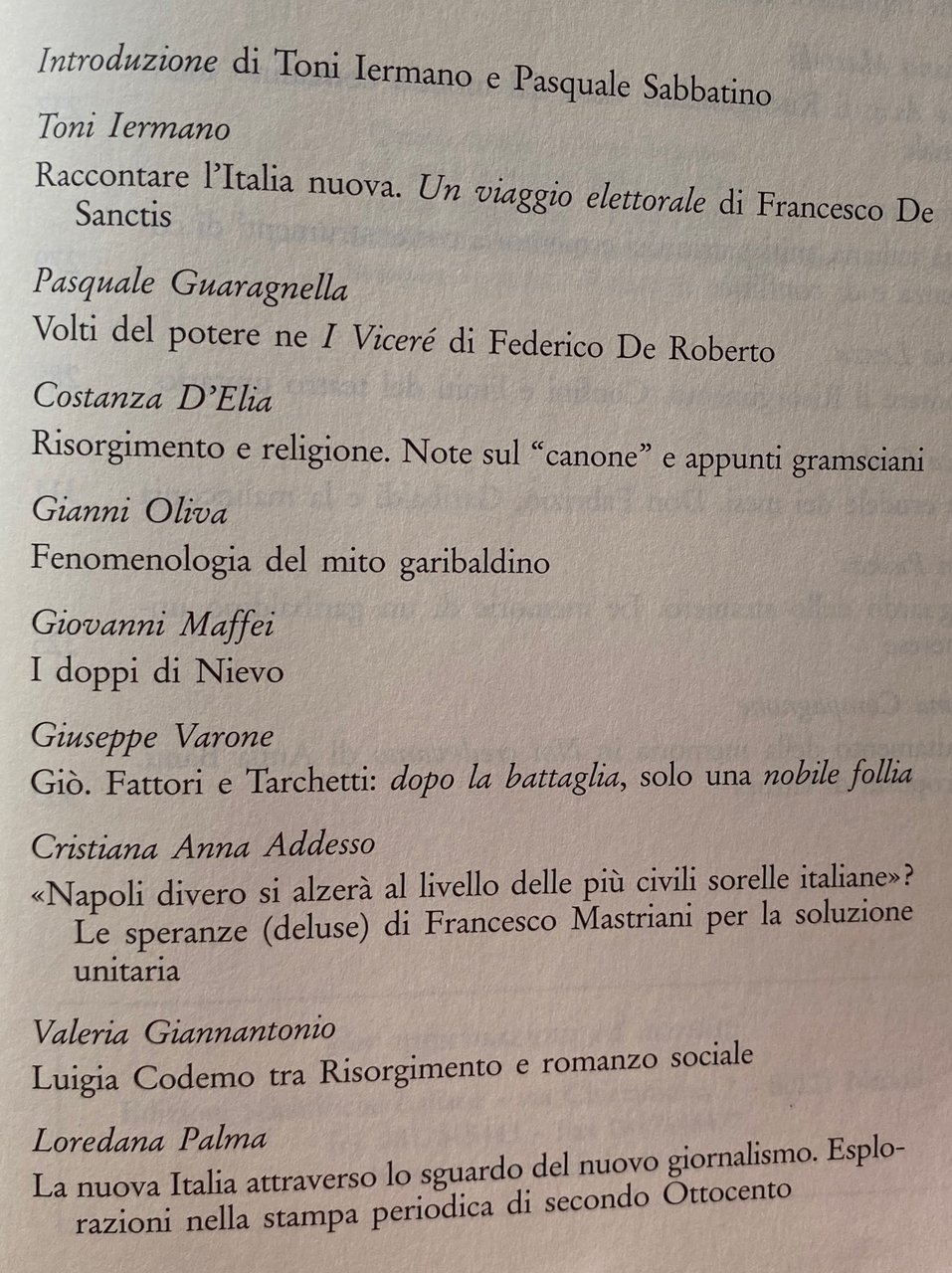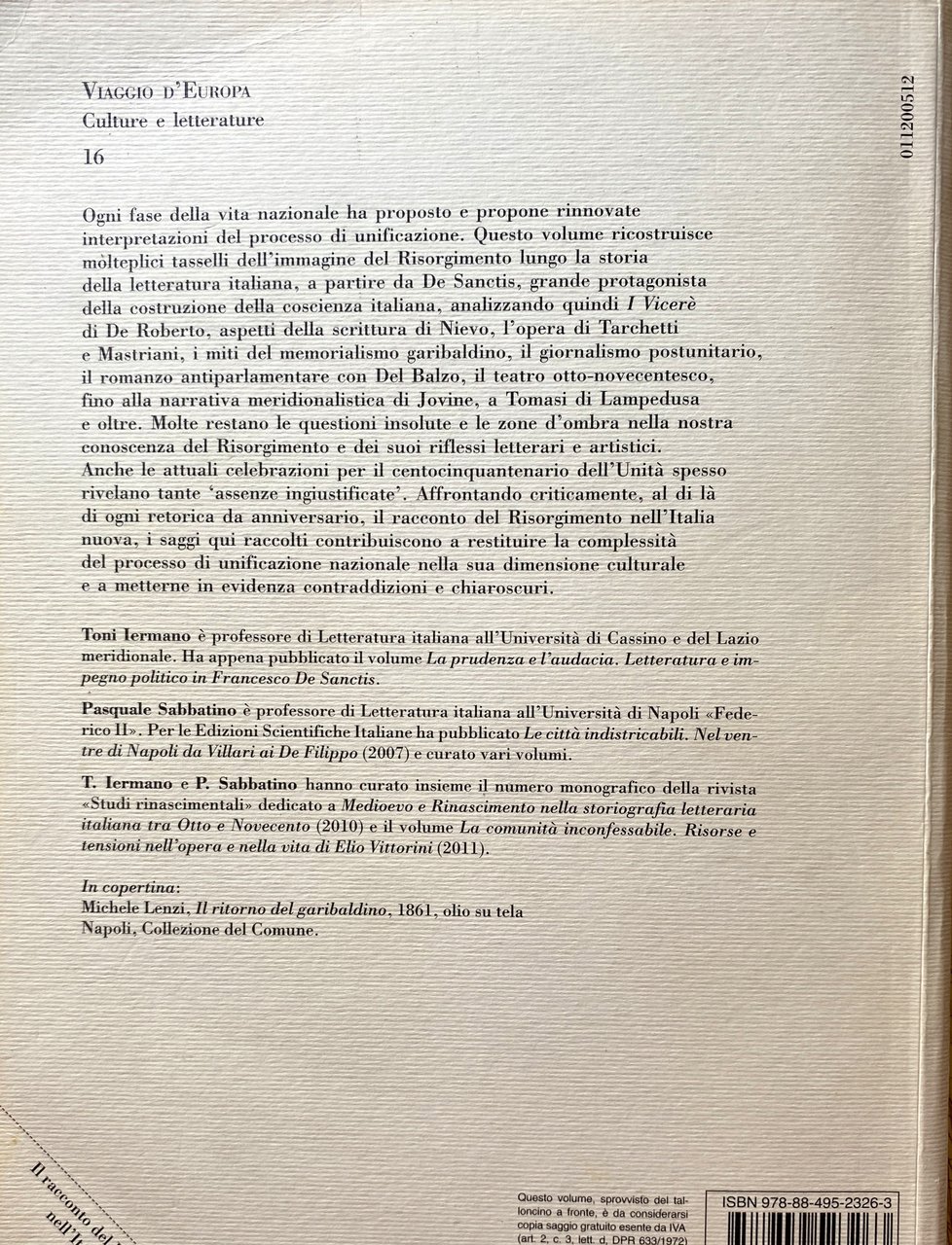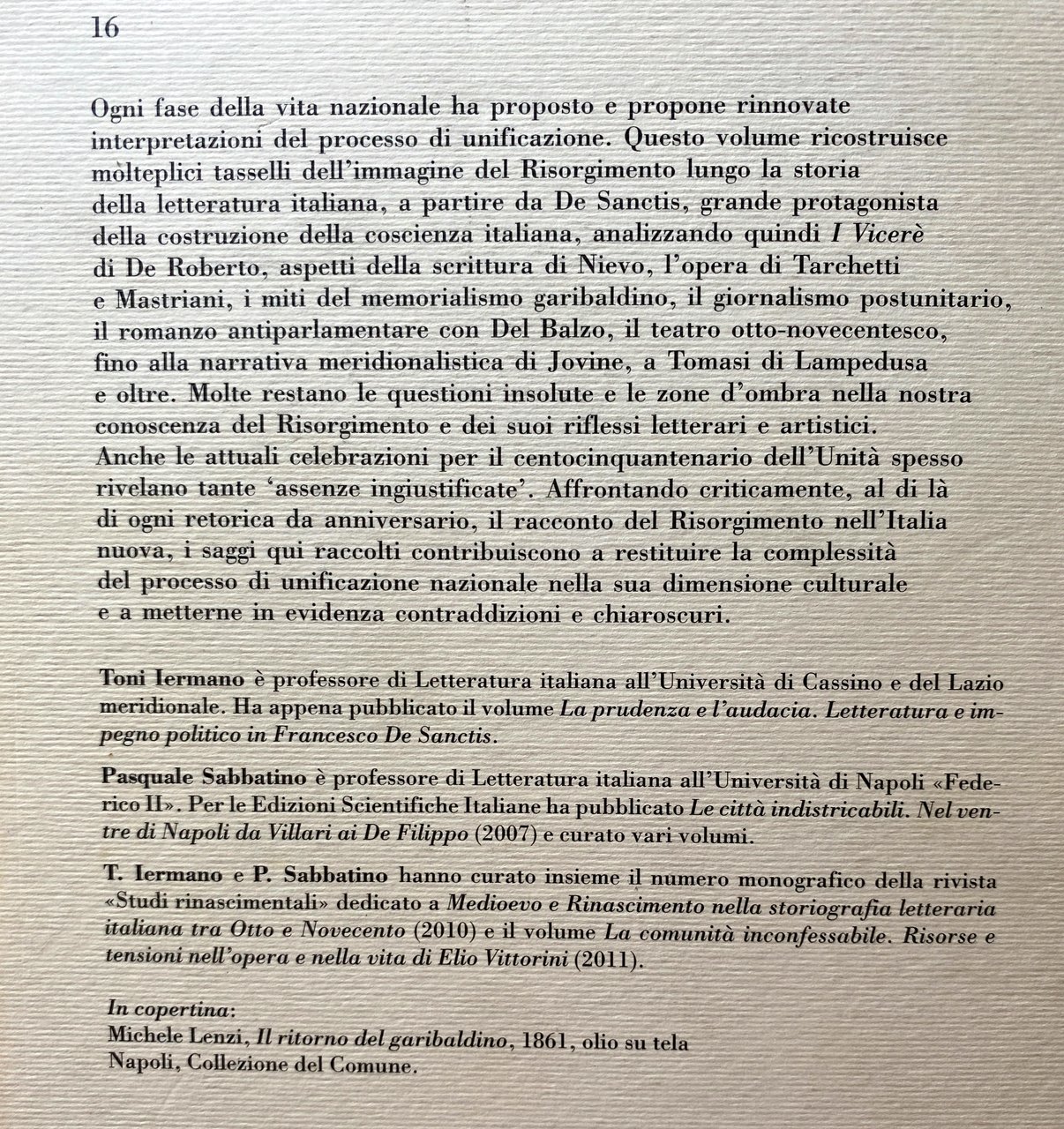 Soggetti: Storia d'Italia Unità Unificazione Letteratura italiana Memorialisti Drammaturgia Narrativa storica Miti Eroismo Meridionalismo Brigantaggio Garibaldi Sud Storiografia Narrazione Racconti Seminari Convegni Studi culturali Papers Saggistica Libri rari fuori catalogo Produzione letteraria Vicende Problemi affrontati Impegno civile Francesco De Sanctis I Viceré Mito risorgimentale Idealismo Ideali Mazzini Patria Patriottismo Guerre Indipendenza Ungheria Tempo Morte Principe Salina Viaggio elettorale Heine Poemetto Germania Costumi Corruzione Romanzo storico Romanzi Tradimento Uzeda Nobili Borboni Nobiltà Aristocrazia Classi popolari Sbarco Sicilia Piemonte Savoia Regno Sardegna Briganti Camorra Borbonici Parlamentar Popolazione Mezzogiorno Cultura popolare Cristianesimo Chiesa Stato Jacopo Ortis Antipapale Anticlericalismo Promessi Sposi Manzoni Confessioni Nevio Neviane Tesi Mengaldo Dialettica Gioberti Il barone di Nicastro Età Moderna Nazionalismo Identità Lingua Ugo Tarchetti Psiche Tommaseo Fede Bellezza Antimilitarismo Edmondo De Amicis Mastriani Governo borbonico Guardia Nazionale Scritti giornalistici Elezioni Malcostume Famiglie Onesimo Nazario I misteri di Napoli Poetica Verismo Romanzo sociale Luigia Codemo Caterina Percoto Donne Realismo Naturalismo George Sand Giornali Stampa Editoria Propaganda Biagio Caranti Catechismo politico Contadini Omnibus 1860 1861 Divisioni regionali Dialetto Dialetti Coscienza risorgimentale Riviste Illustrazione per tutti Pittori Iconografia Pittura Michele Cammarano Moti 1848 Napoletani Popolani Artisti Letterati Ostriche Carlo del Balzo Vita politica Leonida Barnaba Francesco Crispi Personaggi Dialoghi Onorevole Foglietta Potere Estrema sinistra Francesco Jovine Signora Ava Borghesia Molise Modernità Contadini Fatalità Borghesi Retorica Carlo Emilio Gadda Frammentazione Fascismo Sacrificio Teatro I mafiusi della Vicaria Palermo Commedia Dialettale Sciascia Il Gattopardo don Fabrizio Cultura ungherese Séndor Teleki Europa Sentimento nazionale Hugo Dumas padre Spedizione dei Mille Epopea Costumi locali Domenico Lopresti Destra Gramsci Caleidoscopio Carlo Levi Chiarini Cortese Debenedetti Benedetto Croce Abruzzo Campania Lucania Calabria Puglia Madrignani Spinazzola Paratore Bianciardi Nicola Palizzi Michele Cammarano Biografie Memorie Mamiani Settembrini I vermi Villari Viviani Treves Malavoglia Maffei Marinella Colummi Camerino Jemolo Bibliografia Riferimento History Italy Unity Unification Italian literature Memorialists Dramaturgy Historical fiction Myths Heroism Southernism Brigandage South Historiography Narration Stories Seminars Conferences Cultural studies Non-fiction Rare books out of print Literary production Events Problems Civil commitment Viceroy Myth Ideals Homeland Patriotism Wars Independence Time Death Prince Electoral journey Poem Germany Customs Corruption Historical Novels Betrayal Nobles Nobility Aristocracy Popular classes Landing Sicily Piedmont Savoy Kingdom Sardinia Bourbon Brigands Parliamentarian Population Popular culture Christianity Church State Antipapal Anticlericalism Betrothed Confessions Thesis Dialectic Modern Age Nationalism Identity Language Psyche Faith Beauty Antimilitarism Government National Guard Writings journalistic Elections Malpractice Families Mysteries of Naples Poetics Realism Social Women Newspapers Press Publishing Political catechism Peasants Regional divisions Dialects Consciousness Magazines Illustration for all Painters Iconography Painting Neapolitan uprisings Commoners Artists Literary Oysters Political life Characters Dialogues Power Far left Bourgeoisie Modernity Peasants Fatality Bourgeois Rhetoric Memory Fragmentation Fascism Sacrifice Theater Mafia Dialect Comedy The Leopard Hungarian Culture Europe National Sentiment Expedition Thousand Epic Local Customs Right-wing Kaleidoscope Sicily Biographies Memoirs The Worms Bibliography Reference
