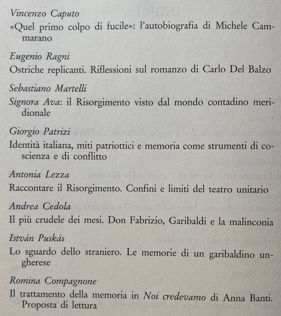 - Storia d'Italia, Unità, Unificazione, Letteratura italiana, Critica letteraria, Letteratura risorgimentale, Memorialistica, Drammaturgia, Narrativa storica, Meridionalismo, Brigantaggio, Storiografia, Racconti, Seminari, Convegni, Studi culturali, Libri rari, Libri fuori catalogo, Produzione letteraria, Impegno civile, Idealismo, Patriottismo, Romanzo storico, Romanzi storici, Mezzogiorno, Cultura popolare, Anticlericalismo, Nazionalismo, Antimilitarismo, Romanzo sociale, Giornalismo, Realismo, Naturalismo, Stampa, Editoria, Propaganda, Catechismo politico, Dialetti