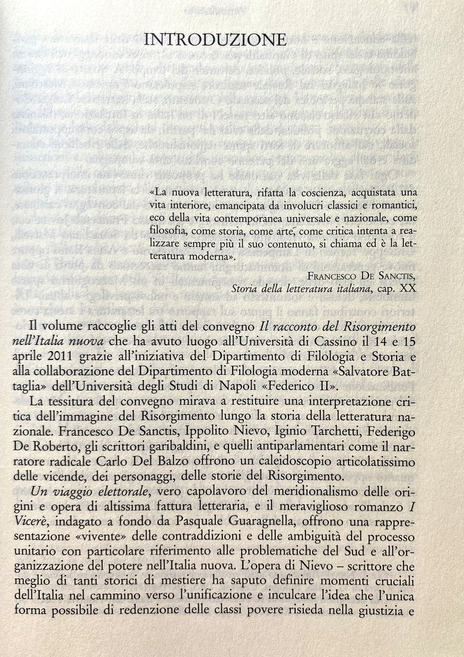 Ogni fase della vita nazionale ha proposto e propone rinnovate interpretazioni del processo di unificazione. Questo volume ricostruisce molteplici tasselli dell'immagine del Risorgimento lungo la storia della letteratura italiana, a partire da De Sanctis, grande protagonista della costruzione della coscienza italiana, analizzando quindi I Vicerè di De Roberto, aspetti della scrittura di Nievo, l'opera di Tarchetti e Mastriani, i miti del memorialismo garibaldino, il giornalismo postunitario, il romanzo antiparlamentare con Del Balzo, il teatro otto-novecentesco, fino alla narrativa meridionalistica di Jovine, a Tomasi di Lampedusa e oltre. Molte restano le questioni insolute e le zone d'ombra nella nostra conoscenza del Risorgimento e dei suoi riflessi letterari e artistici. Anche le attuali celebrazioni per il centocinquantenario dell'Unità spesso rivelano tante assenze ingiustificate. Affrontando criticamente, al di là di ogni retorica da anniversario, il racconto del Risorgimento nell'Italia nuova, i saggi qui raccolti contribuiscono a restituire la complessità del processo di unificazione nazionale nella sua dimensione culturale e a metterne in evidenza contraddizioni e chiaroscuri. Atti del convegno (Università Cassino 14-15 aprile 2011).
