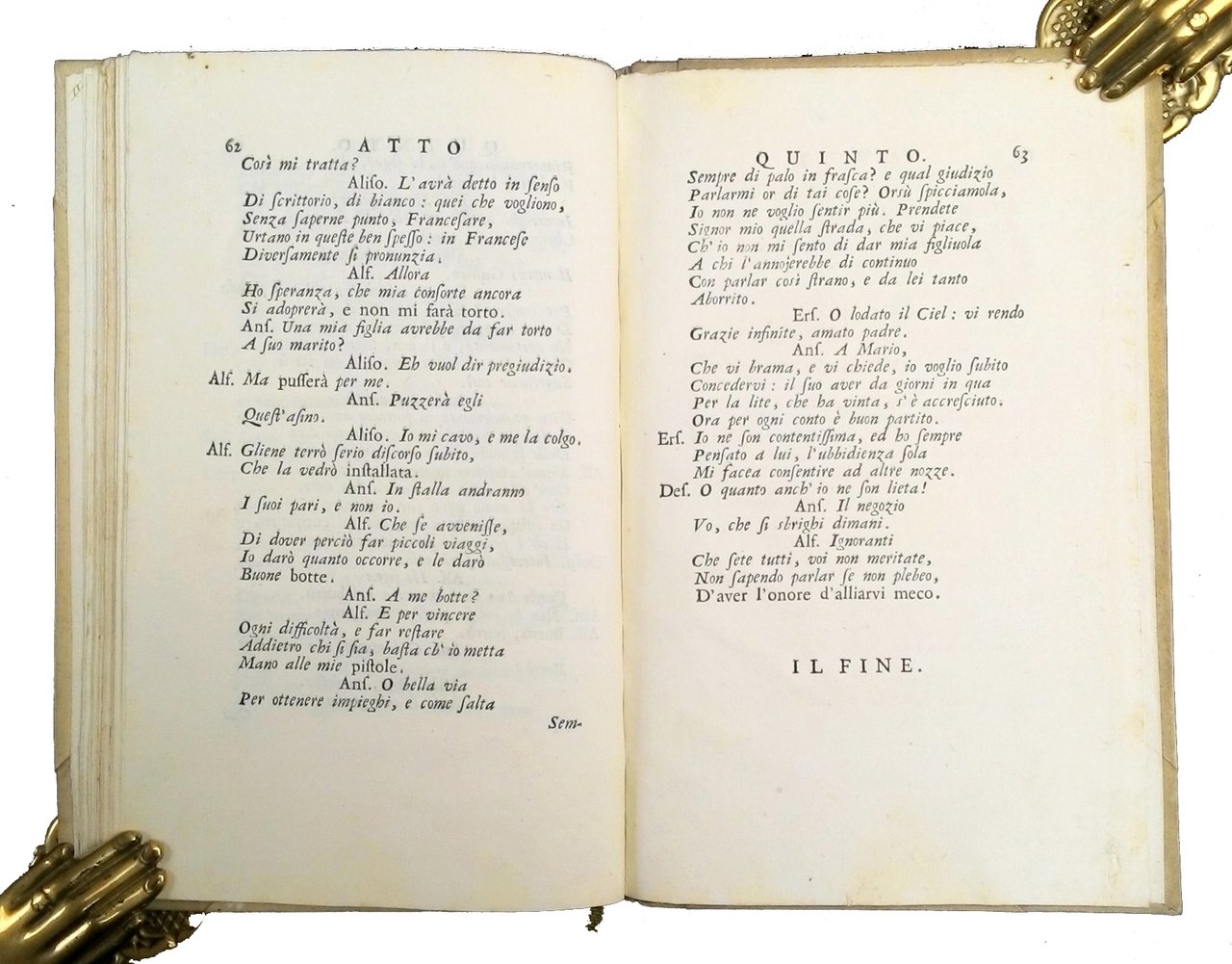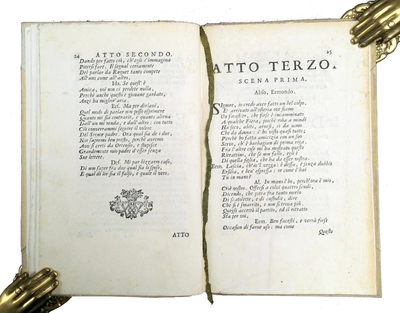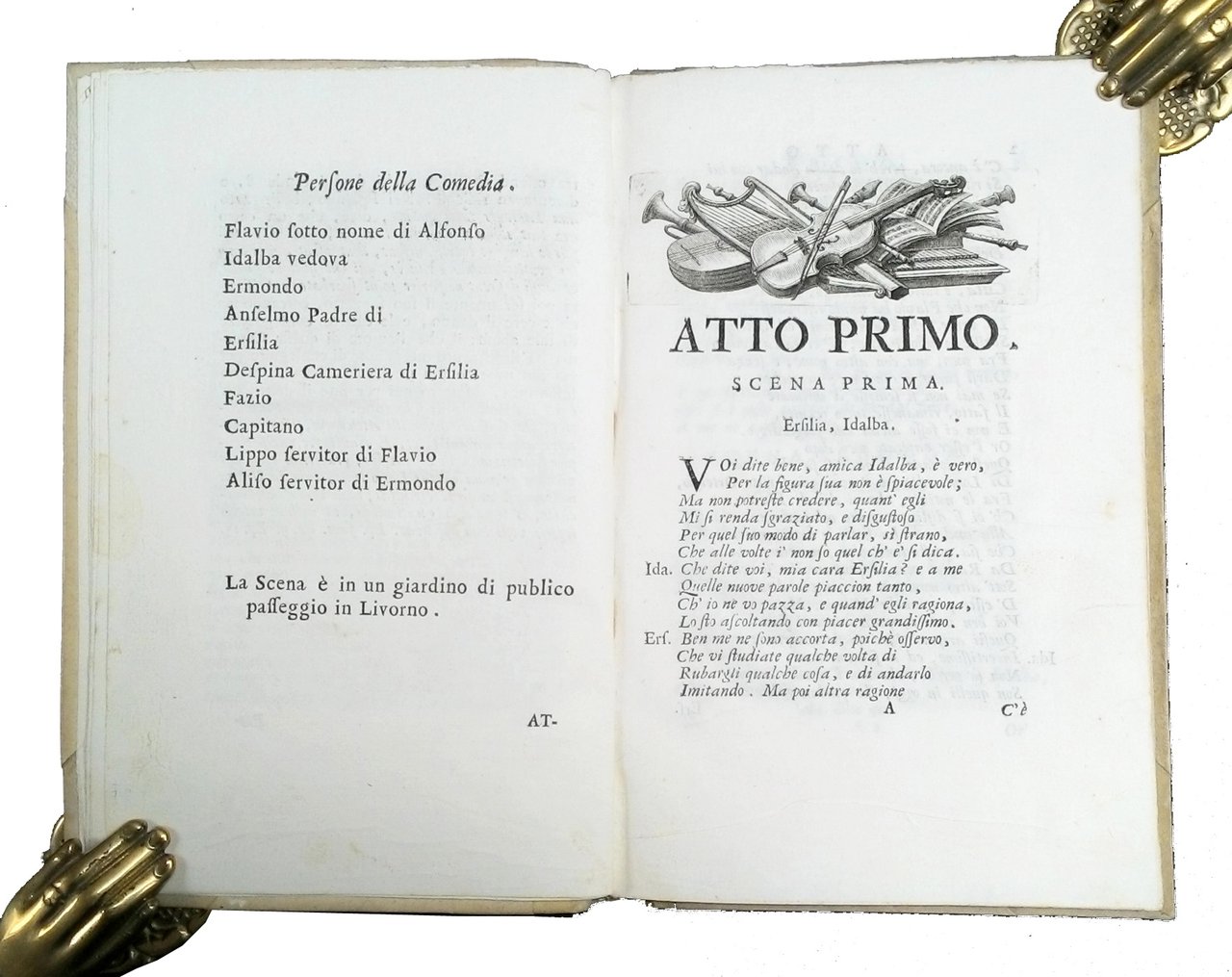 8vo (208x132 mm); leg. in mezza pergamena e carta bianca con titolo a caratteri dorati su tassello in pelle rossa al dorso liscio, nastrino segnapagine; pp. (8), 63, (1 b.); front. a caratteri neri; vignetta calcografica (maschere teatrali) sul front.; iniziale e finali xilografati. Seconda edizione, poco diffusa, di questa commedia del Maffei; per il nome dell'Autore, cfr. Melzi v. 2, p.408. Scipione Maffei (forme varianti: Pindemonte, Desiderato e Brenteatico, Orillo)(1675-1755), erudito, letterato, in Arcadia come poeta, nato e morto a Verona. Prov.: Indicazione d'appartenenza stampata entro cornice su etichetta incollata al contropiatto ant. (ex dono fratris nostri Venier nob. Josephi). Rif.: IT\ICCU\MILE\022080 (8 esemplari). Non censito su OCLC. Cond.: Lievi fioriture, ma opera in condizioni generali molto buone. -- SECOND EDITION, UNCOMMON, OF THIS COMEDY BY MAFFEI. Light foxing, copy in very good condition.