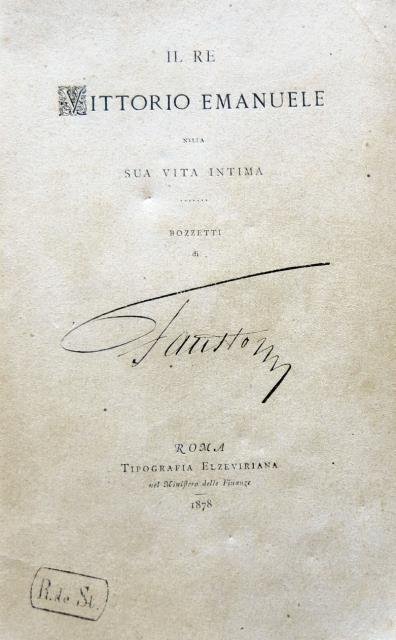 Bozzetti. Roma, Elzeviriana, 1878. In 8vo, pp. 180 con Indici, bross. edit. in carta con firma a stampa dell'Autore poi riportata anche al frontespizio. Esemplare con una mancanza al dorso e quindi un po' allentato, peraltro buono.