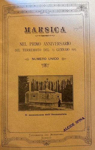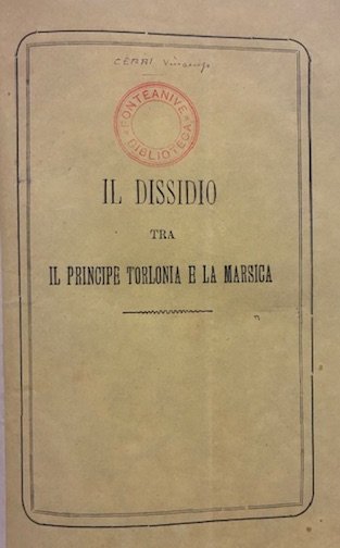 8vo (cm. 27,2), da p. 240 a p. 246(1) (unito) Martin Francesco, Un voto del Consiglio Provinciale di Aquila, Roma, Tipografia dell’Opinione 1882, 39(1) pp. (unito) Marsica. Nel primo anniversario del terremoto del 13 Gennaio 1915. Numero unico, Subiaco, Tipografia dei Monasteri 1916, 41(1) pp. con illustrazioni n.t. (unito) Cerri Vincenzo, Il dissidio tra il Principe Torlonia e la Marsica, Avezzano, s.t. 1882, 55(1) pp. (unito) Schiavone Pasquale, Parere legale sulla vertenza giudiziaria tra l’Ecc.ma Casa Torlonia ed il Comune di Avezzano relativa alla rivendica di una parte delle terre emerse in seguito al prosciugamento del Lago Fucino, Città di Castello, Tipografia dello Stabilimento S. Lapi 1893, 126 pp. Legatura ‘900 in mz. tela. Titolo ‘Marsica vol. VII’ impresso in nero al ds. Indice della Raccolta dattiloscritto su una carta inserita ad inizio volume. Brossure editoriali conservate all’interno. Provenienza: Collezione Spina, Avezzano (timbretti ex libris).