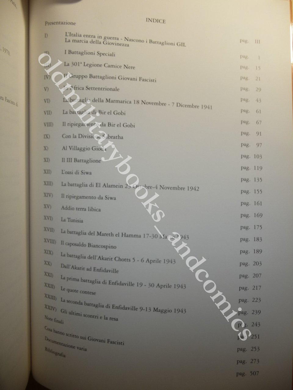 Il più completo e documentato libro sulla storia e sulle geste del Rgt "Giovani Fascisti" in A.S., con 306 illustrazioni (tra cui 191 FOTO di truppe e mezzi, 7 schizzi di battaglie, 126 facsimli di doc. e stampati, 19 distintivi a colori, 20 foto di medaglie 14 uniformi a colori 6 fiamme di combattimento a colori, 23 cartoline e manifesti perlopiù a colori).