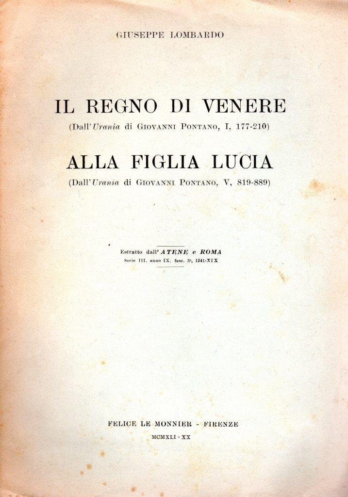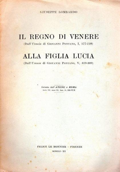 Il regno di Venere - Alla figlia Lucia, prima edizione 1941, formato 17 x 24,5.<BR>Copertina morbida di colore verde con titoli in nero al piatto anteriore.Serie III anni IX. In prima pagina presente dedica dell'autore.<BR>Bruniture al piatto anteriore e posteriore. Nel complesso buone condizioni.