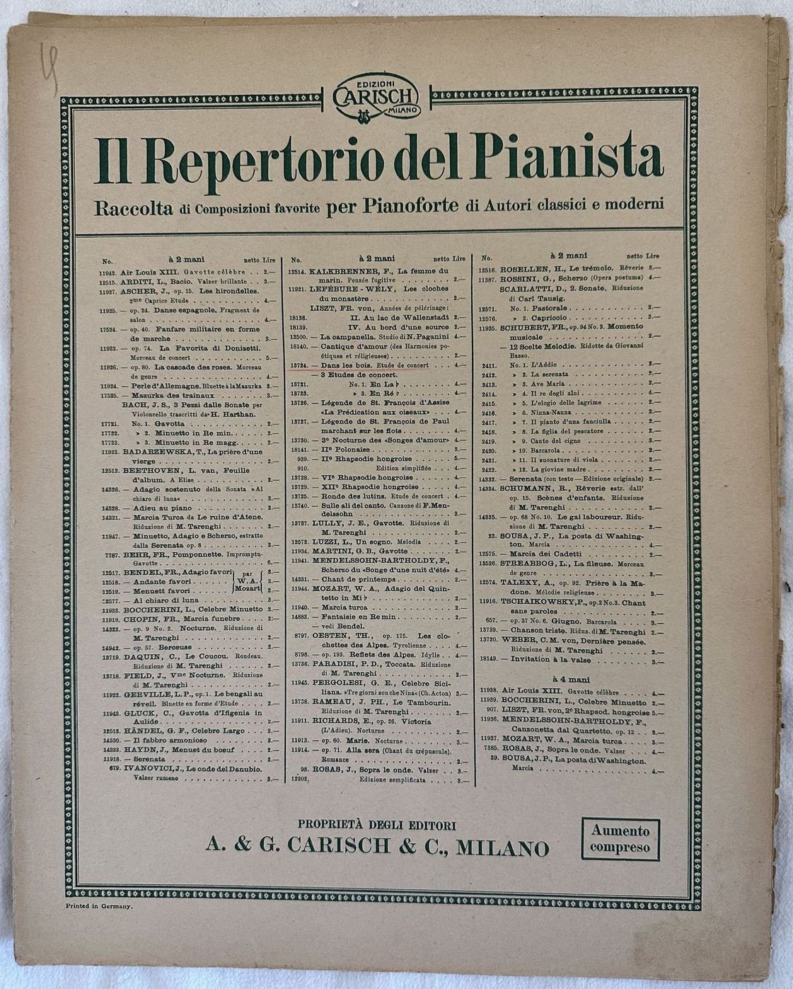 Edizione dei primi del novecento della melodia "Dans les bois" di Franz Liszt (1811-1886) dall'opera "Etude de concert". In buone condizioni. Copertina editoriale in buone condizioni con lievi usure marginali. Legatura editorialmente assente. Pagine in buone condizioni con rare fioriture. In Folio. cm. 34x27. Pp. 9.Edition of early 20th century of the melody "Dans les bois" by Franz Liszt (1811-1886) from the opera "Etude de concert". In good conditions. Editorial cover in good conditions lightly worn in the extremities. Binding is editoriarly missing. Pages in good conditions with occasional foxing. In Folio. cm. 34x27. Pp. 9.