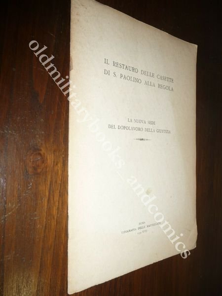 TITOLO: IL RESTAURO DELLE CASETTE DI S. PAOLINO ALLA REGOLA LA NUOVA SEDE DEL DOPOLAVORO DELLA GIUSTIZIA DESCRIZIONE: Tip. delle Mantellate Roma 1939, br. ed. pp. 14 con alcune ill. b/n n.t. in 8°. CONDIZIONI: Buone tracce di polvere. PESO / WEIGHT: 100 gr. without package