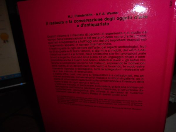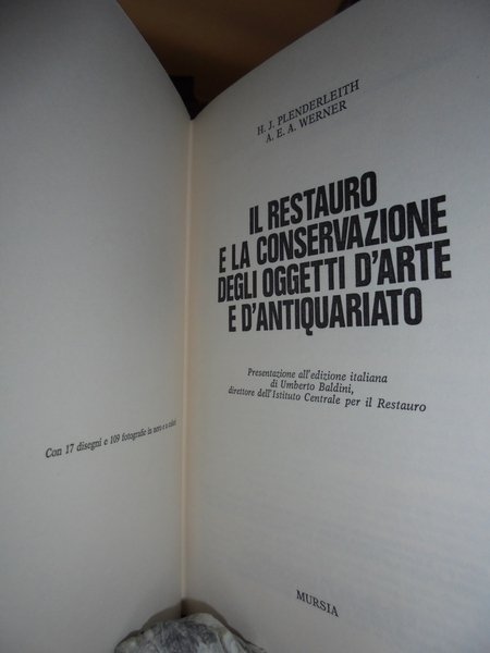 H.J. Plenderleith - A.E.A. Werner. Milano, Mursia Editore, 1986. Il Restauro e la conservazione degli oggetti d' Arte e d' Antiquariato. In-8°, cartonato edit. 279 pp. con illustrazioni n.t. 24 tavole f.t., e altre 46 illustrazioni n.t. Come nuovo. Neg. mob. nero