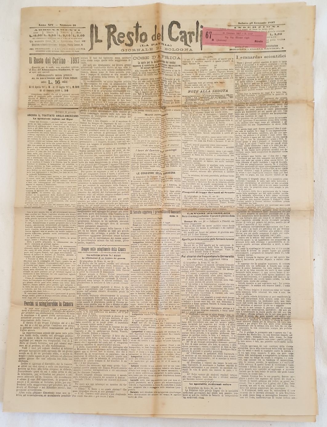 Numero del 16 gennaio 1897 del quotidiano "Il resto del Carlino" quotidiano fondato a Bologna nel 1885.<BR>Tra gli articoli presenti: Ancora il trattato anglo americano La spedizione inglese sul Niger, Le condizioni della Sardegna: nuemro disoccupati, I canards scientifici, Missione Nerazzini, Scioglimento della Camera, Il digiunatore Succi uscito dal manicomio, Un colloquio con G. Emanuel reduce del Brasile, La corsa al galoppo in Italia nel 1897, Uno scambio di persona? Luigi Dalfiume di Castel San Pietro, A Cuba e alle Filippine ecc. Numerose pubblicita d'epoca. In buone condizioni. Brossura editoriale in buone condizioni generali con lievi usure ai margini e dorso. Legatura assente. Pagine in buone condizioni. Usure marginali. In folio. Dim. 58x40,5 cm. Pp. (4)Number of the 16th of january 1897 of the daily newspaper "Il resto del Carlino" daily newspaper established in Bologna in 1885.<BR>The articles inside:Anglo american treaty English expedition to Niger, Conditions of Sardinia: number of people without a jobn scientiphic canards, Nerazzini Mission, Succi, A speech with G. Emanuel from Brasil, La corsa al galoppo in Italy in 1897, An exchange of eprson? Luigi Dalfiume of Castel San Pietro, In Cuba and Filippine ecc.<BR>In good conditions. Editorial cover in good general conditions slightly worn in the edges and spine. Binding is missing. Inside pages are in good conditions. Worn edges. In folio. Dim. 58x40,5 cm. Pp. (4)