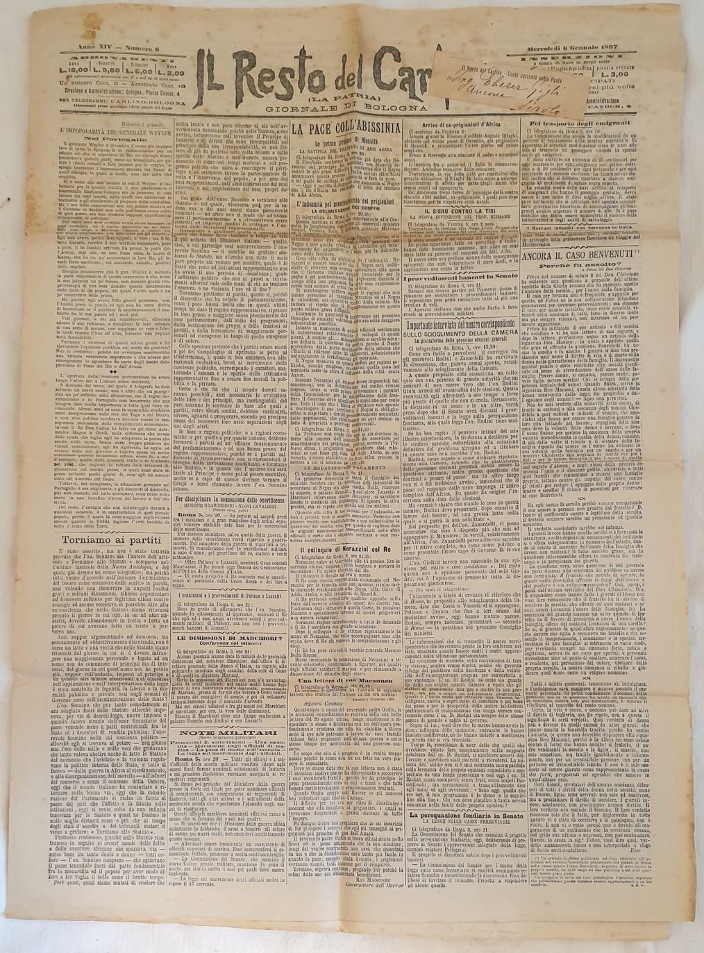 Numero del 6 gennaio 1897 del quotidiano "Il resto del Carlino" quotidiano fondato a Bologna nel 1885.<BR>Tra gli articoli presenti: L'impopolarita del Generale Weyler, La pace coll'Abissinia, Il siero contro la tisi invenzione del Prof. Niemann, Ancora il caso Benvenuti, Le dimissioni di Marchiori, Il colloquio di Nerazzini col Re, Una lettera di Ras Maconnen, Il discorso del'Avv. Fuortes, A Cuba e alle Filippine ecc. Numerose pubblicita d'epoca. In buone condizioni. Brossura editoriale in buone condizioni generali con lievi usure ai margini e dorso. Legatura assente. Pagine in buone condizioni. Usure marginali. In folio. Dim. 58x40,5 cm. Pp. (4)Number of the 6th of january 1897 of the daily newspaper "Il resto del Carlino" daily newspaper established in Bologna in 1885.<BR>The articles inside: unpopularity of general Weyler, Peace with Abissinia, Sierum against tysis invention of Prof. Niemann, Case Benvenuti, Marchiori, the speech of Nerazzini with the King, A letter of Ras Maconnen, a speech of Avv. Fuortes, In Cuba and in Filippine ecc.<BR>In good conditions. Editorial cover in good general conditions slightly worn in the edges and spine. Binding is missing. Inside pages are in good conditions. Worn edges. In folio. Dim. 58x40,5 cm. Pp. (4)