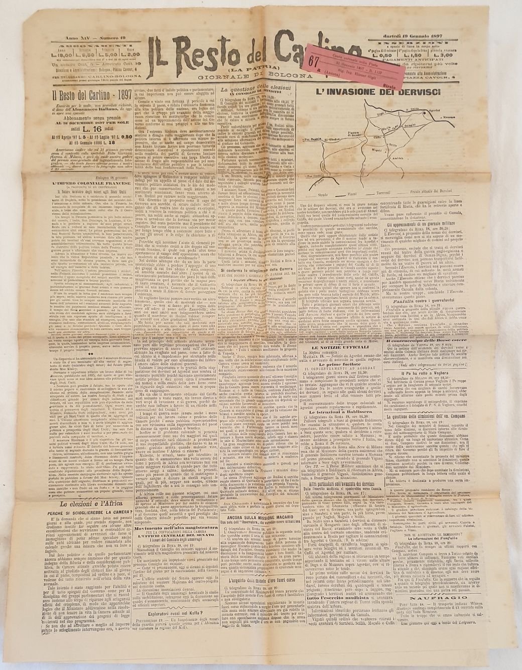 Numero del 24 gennaio 1897 del quotidiano "Il resto del Carlino" quotidiano fondato a Bologna nel 1885.<BR>Tra gli articoli presenti: Gli scandali nel municipio di Madrid, La situazione ad Aligrat, La spedizione inglese su Khartum, Il sultano di Zanzibar, L'arrivo di Baldissera a Roma, Conferenze ufficiali sull'Africa, Dario Papa, Una donna che partorisce un orso a Napoli, San Giorgio di Piano, L'assoluzione dell'Avvocato Rivaroli, Dimissioni del Prof. Pascoli ecc. Numerose pubblicita d'epoca. In buone condizioni. Brossura editoriale in buone condizioni generali con lievi usure ai margini e dorso. Legatura assente. Pagine in buone condizioni. Usure marginali. In folio. Dim. 58x40,5 cm. Pp. (4)Number of the 24rd of january 1897 of the daily newspaper "Il resto del Carlino" daily newspaper established in Bologna in 1885.<BR>The articles inside: Scandals of municipio of Madrid, Situation in Aligrat, English expedition to Khartum, The Sultan of Zanzibar, Arrival of Baldissera in Rome, Official conferences in Africa, Dario Papa, A woman who deliverrs a wolf in Naples, San Giorgio di Piano, Abvsolution of the Lawyer Rivaroli, Prof. Pascoli ecc. In good conditions. Editorial cover in good general conditions slightly worn in the edges and spine. Binding is missing. Inside pages are in good conditions. Worn edges. In folio. Dim. 58x40,5 cm. Pp. (4)