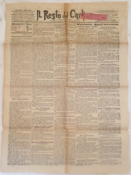 Numero del 25 gennaio 1897 del quotidiano "Il resto del Carlino" quotidiano fondato a Bologna nel 1885.<BR>Tra gli articoli presenti: Cecil Rhodes a Londra e la grave situazione nell'Africa, La degradazione del Capitano Pesce, La campagna contro i Dervisci, I commenti alla condotta di Baldissera, Conflitto fra l'Imperatore Guglielmo e la famiglia Bismarck, Prigionieri di Menelik, Preparativi per inviare un corpo di spedizione di Africa, L'eredità massone alla Cassazione di Torino, Il Ministro Gianturco a Bologna, Adunanza degli utenti della Chiusa di Casalecchio e del Canale di Reno ecc. Numerose pubblicita d'epoca In buone condizioni. Brossura editoriale in buone condizioni generali con lievi usure ai margini e dorso. Legatura assente. Pagine in buone condizioni. Usure marginali. In folio. Dim. 58x40,5 cm. Pp. (4)Number of the 25th of january 1897 of the daily newspaper "Il resto del Carlino" daily newspaper established in Bologna in 1885.<BR>The articles inside: Cecil Rhodes in London and difficult situation in Africa, Decrease of Captain Pesce, Campaign against Dervisci, Comments to behaviour of Baldissera, Conflict between Emperor Guglielmo and Family Bismarck, Prisoners of Menelik, Body of expedition to Africa, Freemasonry heredity in Cassazione of Turin, The Minister Gianturco in Bologna, Reunion of users in Chiuda of Casalecchio and Channel of Reno ecc. In good conditions. Editorial cover in good general conditions slightly worn in the edges and spine. Binding is missing. Inside pages are in good conditions. Worn edges. In folio. Dim. 58x40,5 cm. Pp. (4)
