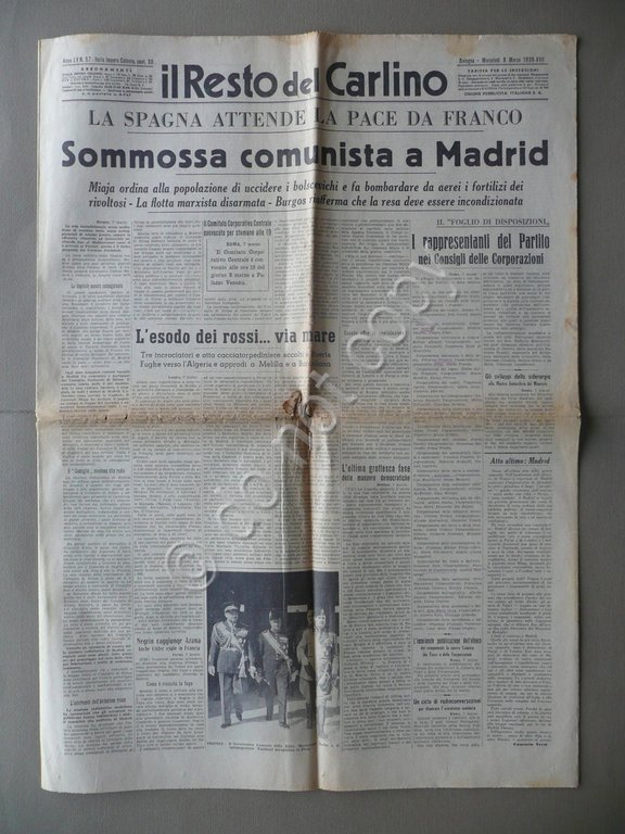 Quotidiano, La Spagna attende la pace da Franco Sommossa comunista a Madrid" in "Il Resto del Carlino" anno LV - numero 57 mercoledì 8 marzo 1939 Bologna 1939, cm 58x43, pp. 8 con qualche ill. fot. in b/n nel testo; numero completo. Condizioni di conservazione Esemplare complessivamente in buono stato con tracce d'uso, normali pieghe di conservazione, qualche pagina con brevi sottolineature e piccoli segnetti a matita viola e/o a penna verde, margini con poche lievi bruniture, incroci delle pieghe con circoscritte mancanze e piccoli strappetti (vedi foto). Numero completo. A pagina 4 è presente una illustrazione fotografica sullo stato dei lavori della nuova casa littoria di San Giovanni in Persiceto (Bologna). SC03.D9704 N "
