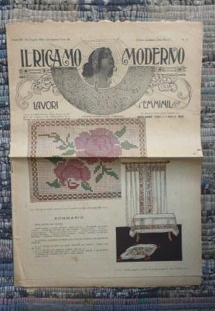 In 4°, cm 37, pp. 12. Annessa una tavola doppia con disegni. SOMMARIO: Tenda, tappeto e cuscini ricamati a punto in croce - Portafoglio con ricamo Gobelin - Portafoglio borsetta con rosa ricamata a mezzo punto - Tendina e stoia per finestra - Motivo per tendine brise bises - Striscia da parete con ricamo a punto palestrina - Camicia Impero ricamata - Federa e lenzuolo con bordura Richielieu - Quadretto ricamato in lana. ANNESSA A QUESTO NUMERO UNA TAVOLA DOPPIACOI SEGUENTI DISEGNI: Disegno di pizzocon angolo Richielieu per lenzuolo e federa - Disegno per combinare tendina - Disegno per combinre stora - Disegno di rettangolo con fiori a punto guipure. Cifre diverse. Piega centrale.